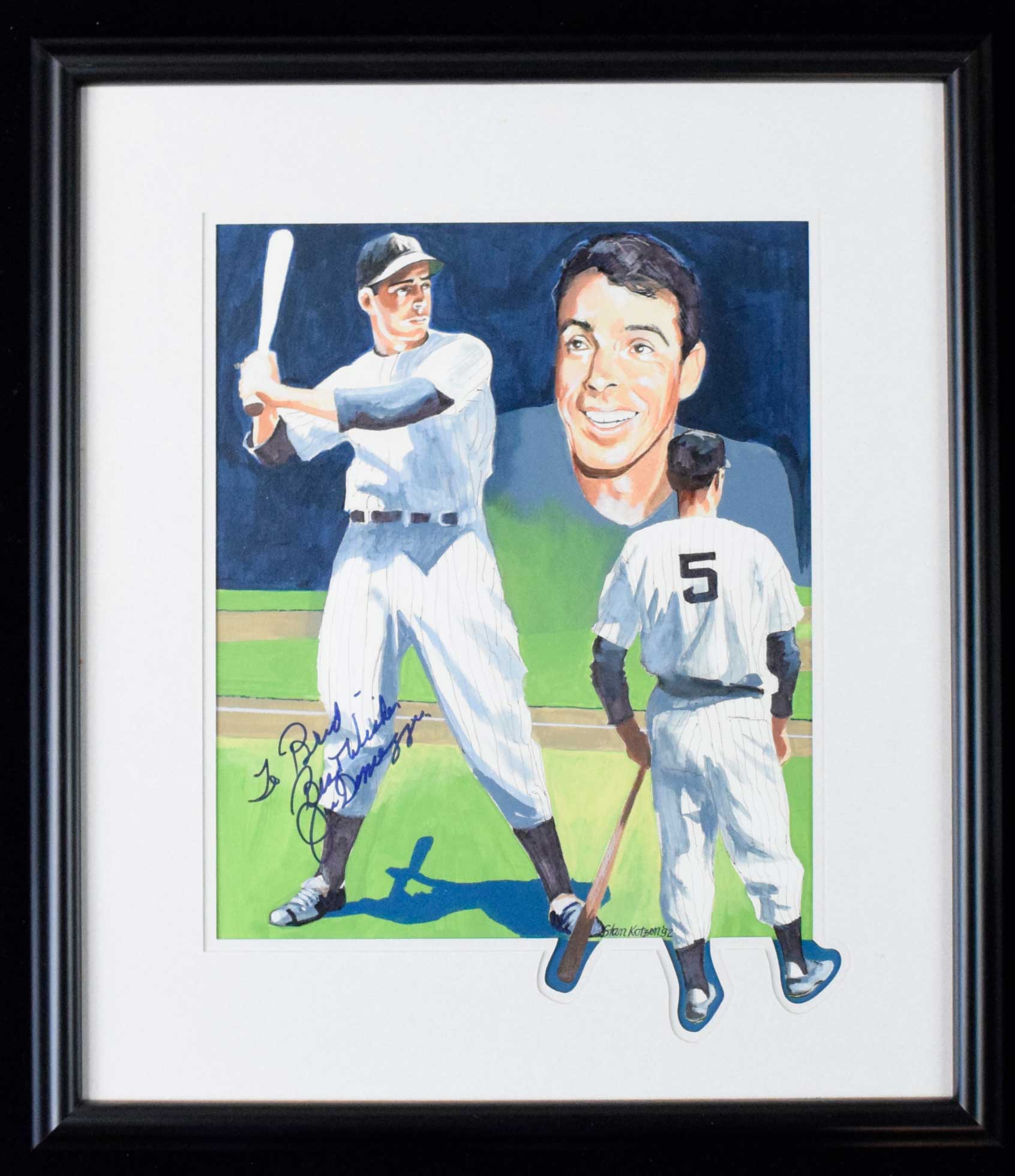 Description:Joe DiMaggio signed 1992 Stan Kotzen painting (NM framed). Frame measures approx. 18.5"x21". DiMaggio signed the painting in blue marker (personalized to Brad). Signature rates 9 out of 10. Also signed by Kotzen and dated '92. Due to framing, complete condition is unknown: NM appearance