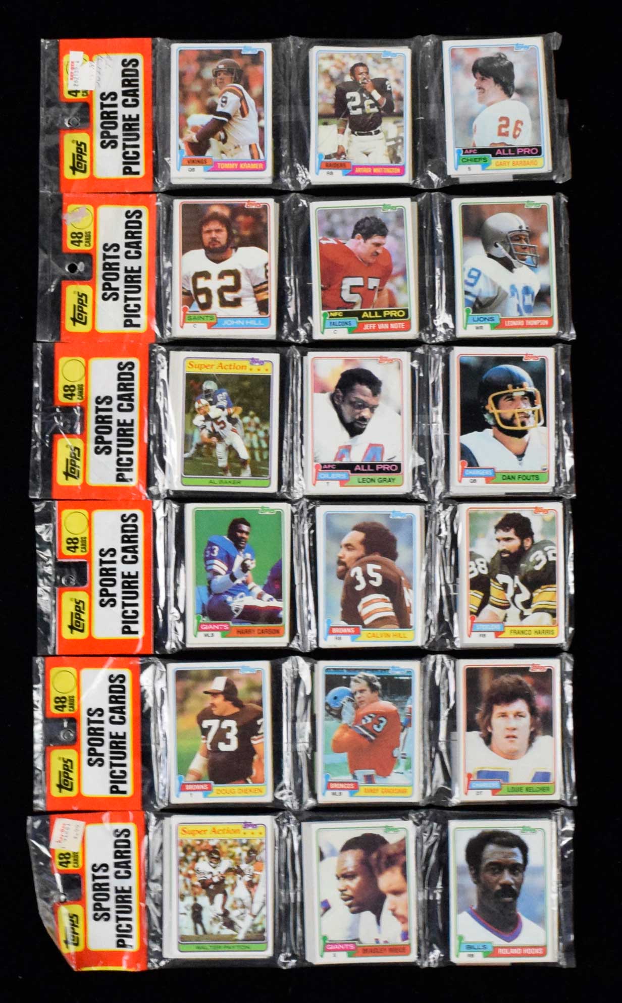 Description:Lot of (6) 1981 Topps Football rack packs (one with Walter Payton Super Action on front) (EX-NM) Total of (6) factory sealed Topps rack packs which have some light scattered storage and handling wear. Two have an Kay-Bee Toys price sticker attached, (1) has some loss where a price sticker was removed. One pack has a Walter Payton Super Action visible on front, one has Dan Fouts on front, one has Franco Harris and Harry Carson on front, and one has a Jim Plunkett on back (this pack has some residue on back): EX-NM ($500-$1,000)