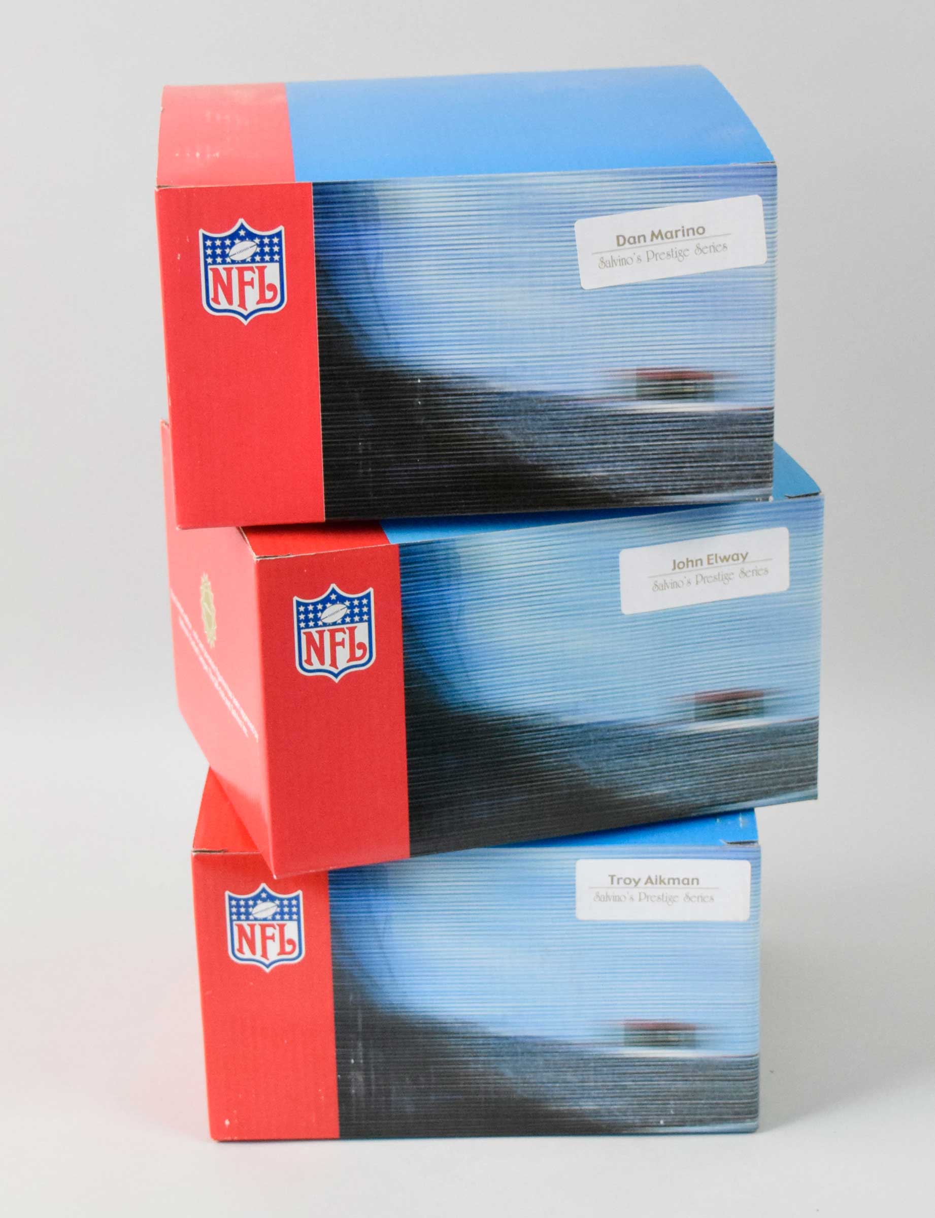 Description:Lot of (7) Salvino statues - mix of Aikman, Elway, Marino (NM-NM/MT). All are from Salvino's Prestige Series. Includes (3) Troy Aikman, (2) John Elway, and (2) Dan Marino. Each comes with its original box: NM-NM/MT overall