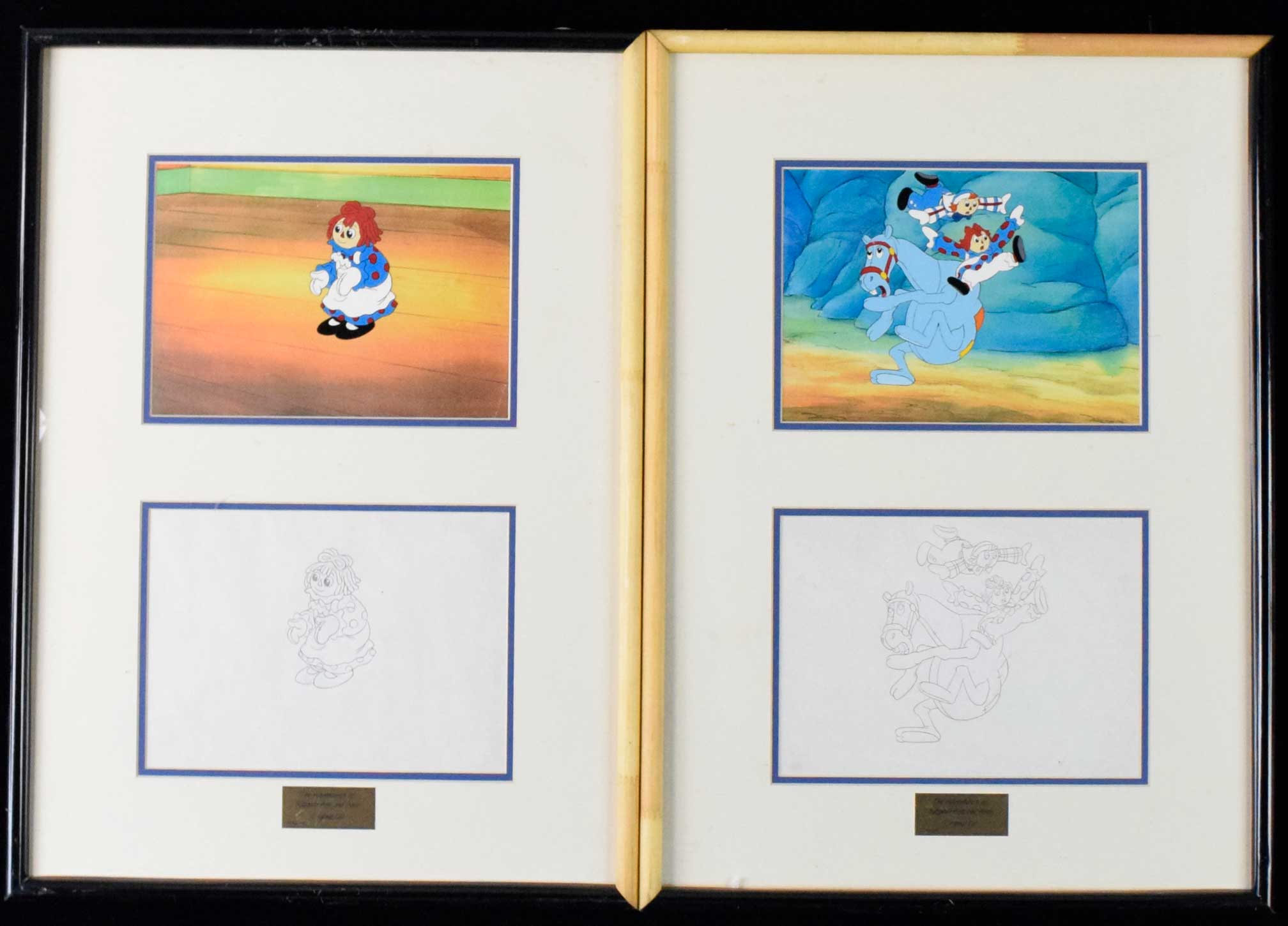 Description:Lot of (2) framed Raggedy Ann & Andy original cels (NM-NM/MT). Frames measure approx. 18.5"x26". Both are of scenes from "The Ransom Of Sunny Bunny" episode. Due to framing, complete conditions are unknown (both frames are missing parts of their black edges), but cels appear high grade: NM-NM/MT appearance