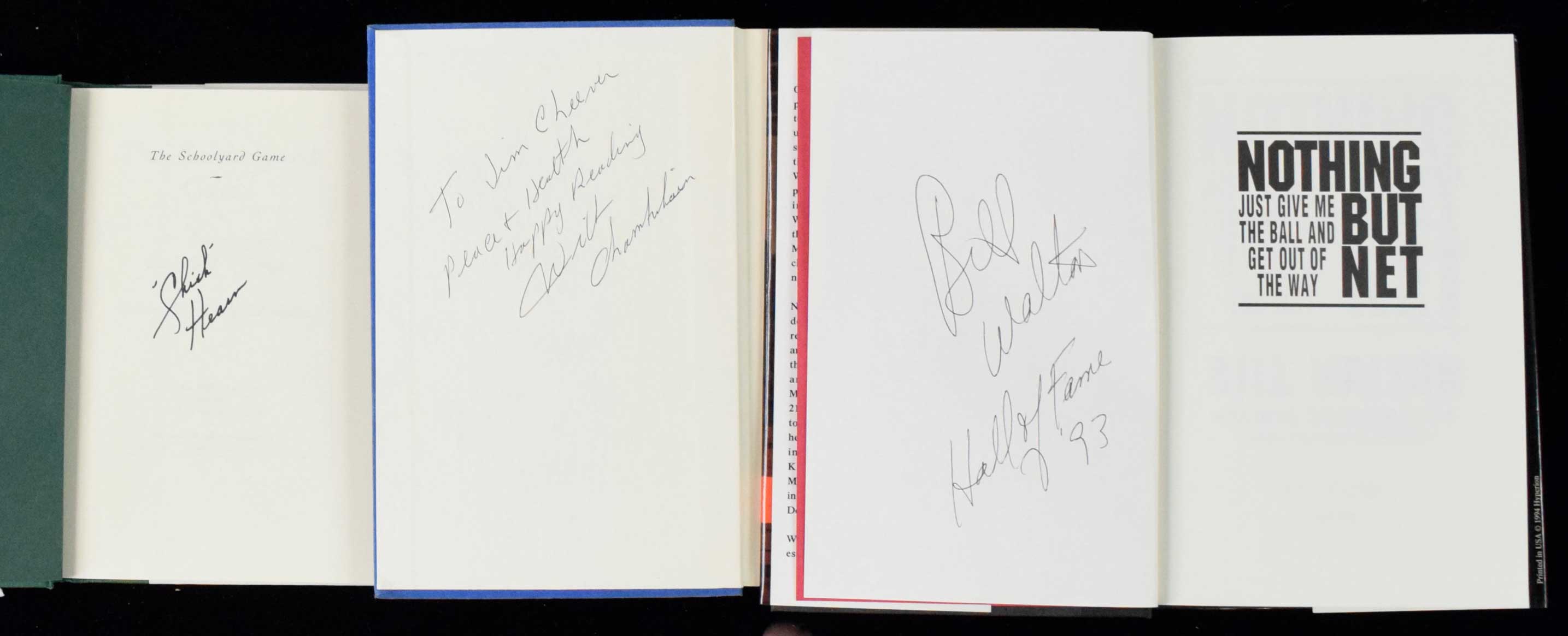 Description:Wilt Chamberlain, Bill Walton, and Chick Hearn signed hardcover books (NM-NM/MT). Includes 1973 "WILT" signed by Wilt Chamberlain (personalized); 1993 "The Schoolyard Game" signed by Chick Hearn; and 1994 "Nothing But Net" signed by Bill Walton with "Hall of Fame 93" inscription. Signatures rate 8/9 to 10 out of 10: NM-NM/MT