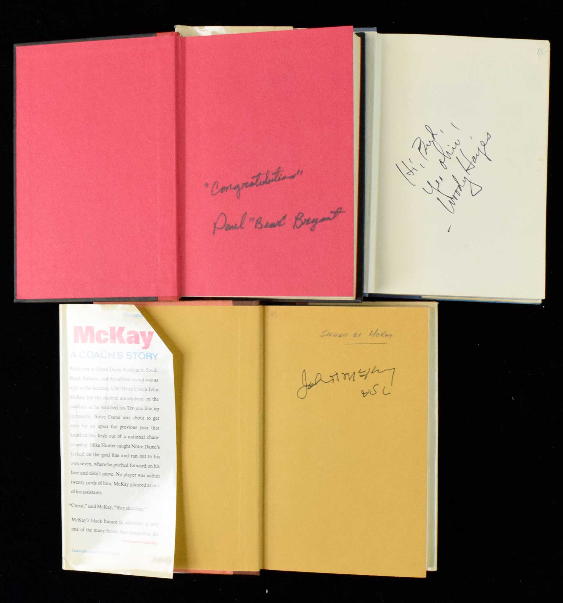 Description:Bear Bryant, Woody Hayes, and John McKay signed hardcover books (EX/MT-NM). Includes 1974 "BEAR" signed by Bear Bryant; 1974 "Woody Hayes and the 100-Yard War" signed by Woody Hayes (personalized to Bud); 1974 "McKay: A Coach's Story" signed by John McKay with "USC" inscription. Signatures rate 8/9 to 10 out of 10: EX/MT-NM