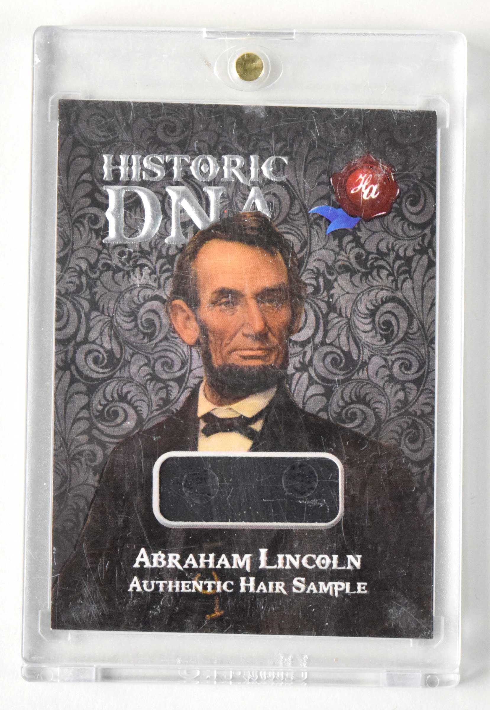 Description:2020 Historic Autographs POTUS Abraham Lincoln "Historic DNA" card ("14/30") (EX/MT-NM) One of the key chase cards in the "Historic DNA" insert set featuring what is described on the card as a strand of Lincoln's hair. Slightest hint of edge wear mentioned for accuracy: EX/MT-NM ($500-$1,000)