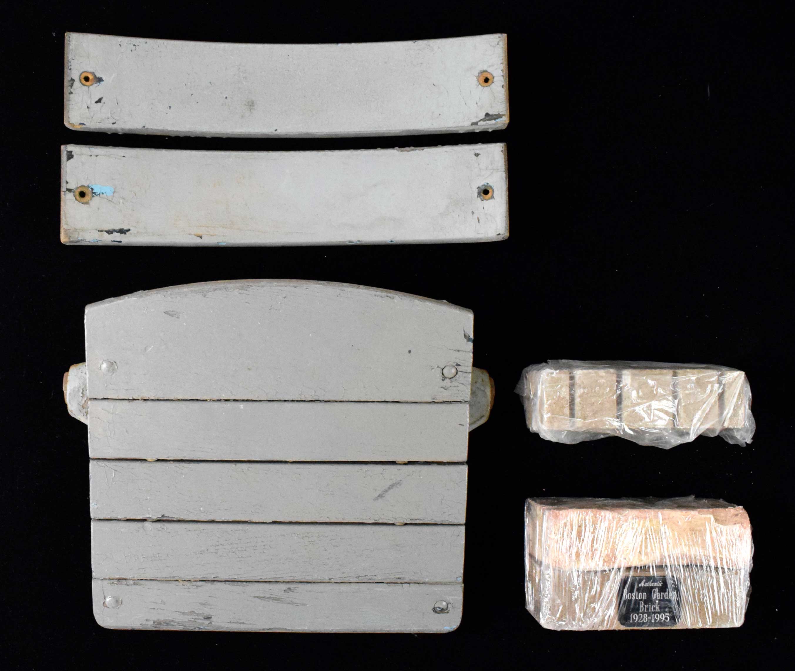 Description:Lot (5) stadium bricks and Connie Mack stadium seat parts (See description) Includes (3) bricks from Comiskey Park bricks, (2) Boston Garden bricks and a seat bottom and two back slats to a seat from Connie Mack stadium.