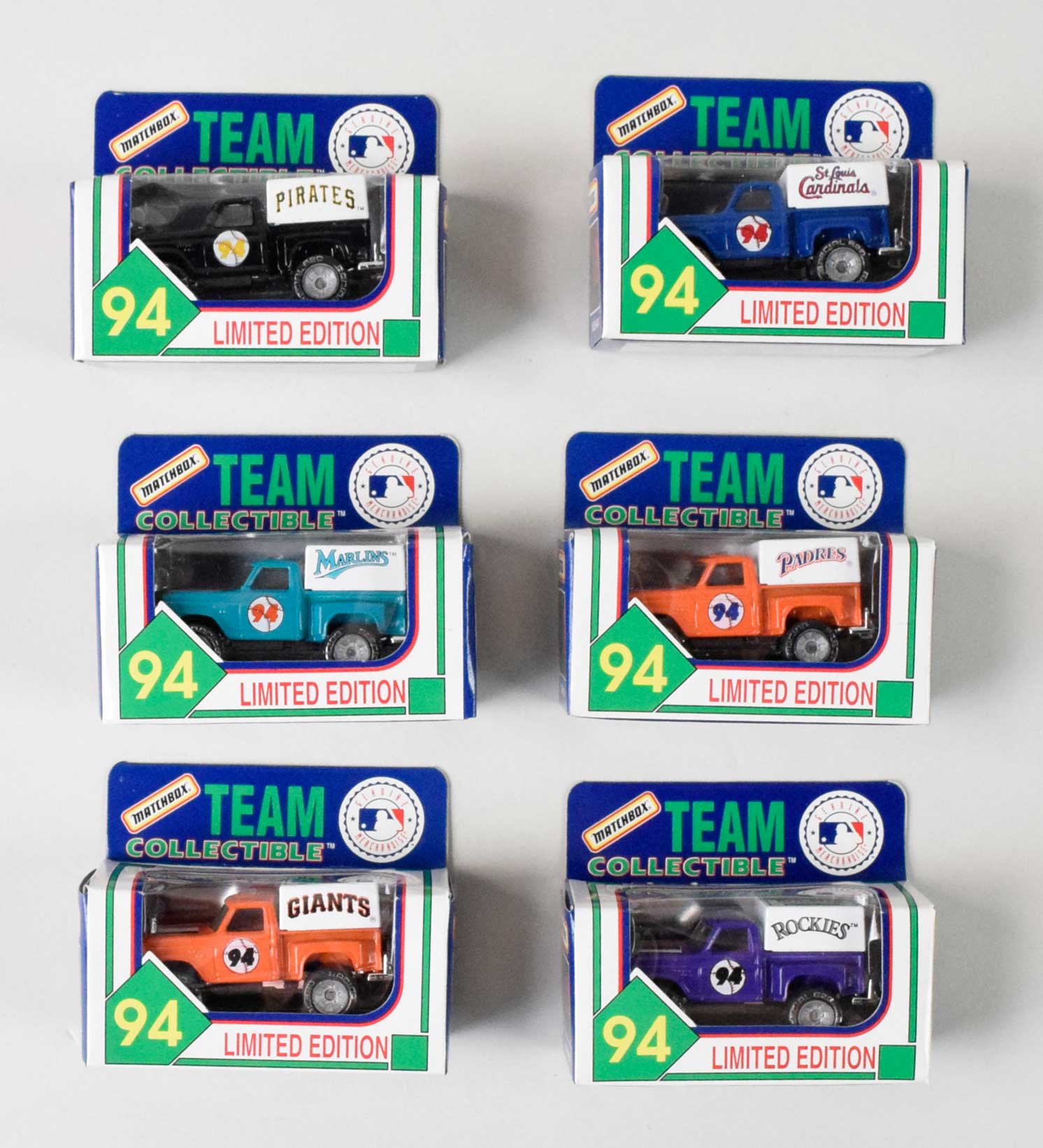 Description:1994 MLB Complete set (28) Diecast trucks by Matchbox (NM/MT) Includes complete set (28) Pick-ups with caps. Pick-ups are of die-cast constructions, caps with team graphics are plastic by matchbox. Each flap of box celebrates the 125th Anniversary of Professional Baseball. All come in OB (NM/MT)