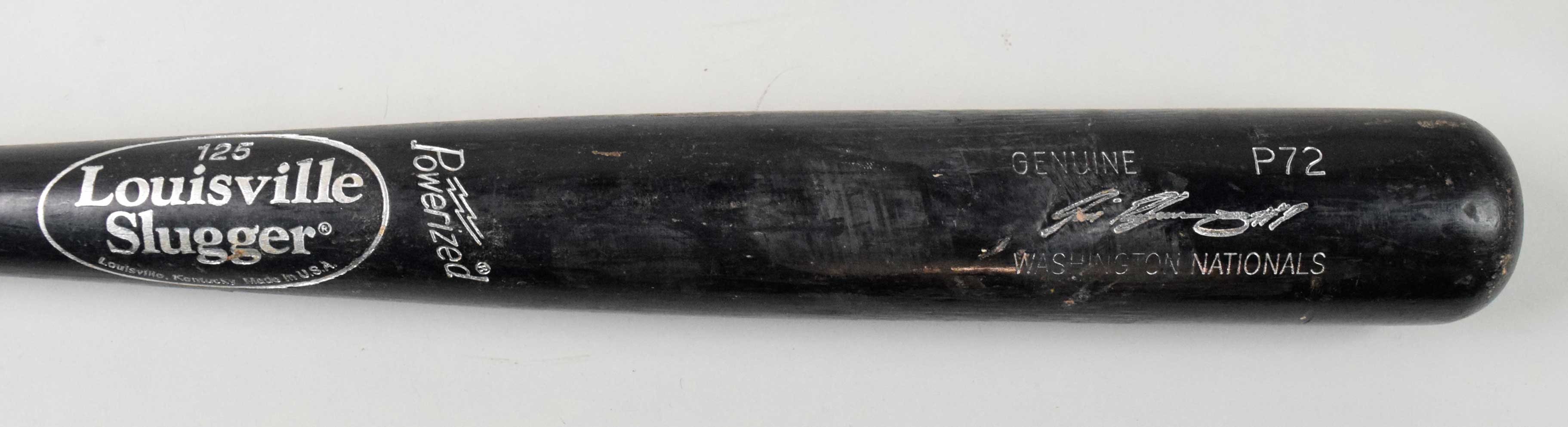 Description:2010 Ivan Rodriguez game used baseball bat (EX very nice use). 34" Louisville Slugger P72 Ivan Rodriguez model bat with his #7 written on the cupped end. Marvelous use with ball marks, stitching impressions, grip tape on the bottom of the handle, light Mota stick residue above and heavy grain swelling. Includes certificate of provenance from Rodriguez: EX