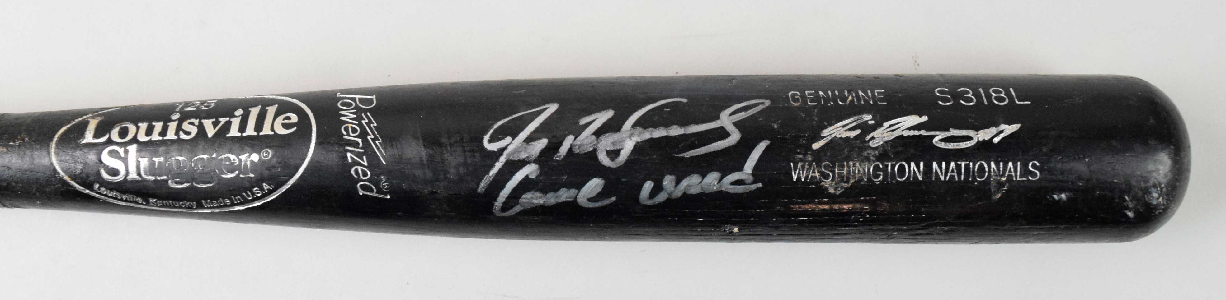 Description:2011 Ivan Rodriguez signed and inscribed game used baseball bat (EX very nice use). 34" Louisville Slugger S318L Ivan Rodriguez model bat. Signed including "Game used" inscription. Marvelous use with ball marks, stitching impressions, heavy Mota stick residue all the way up the handle, and heavy grain swelling. Includes certificate of provenance from Rodriguez: EX