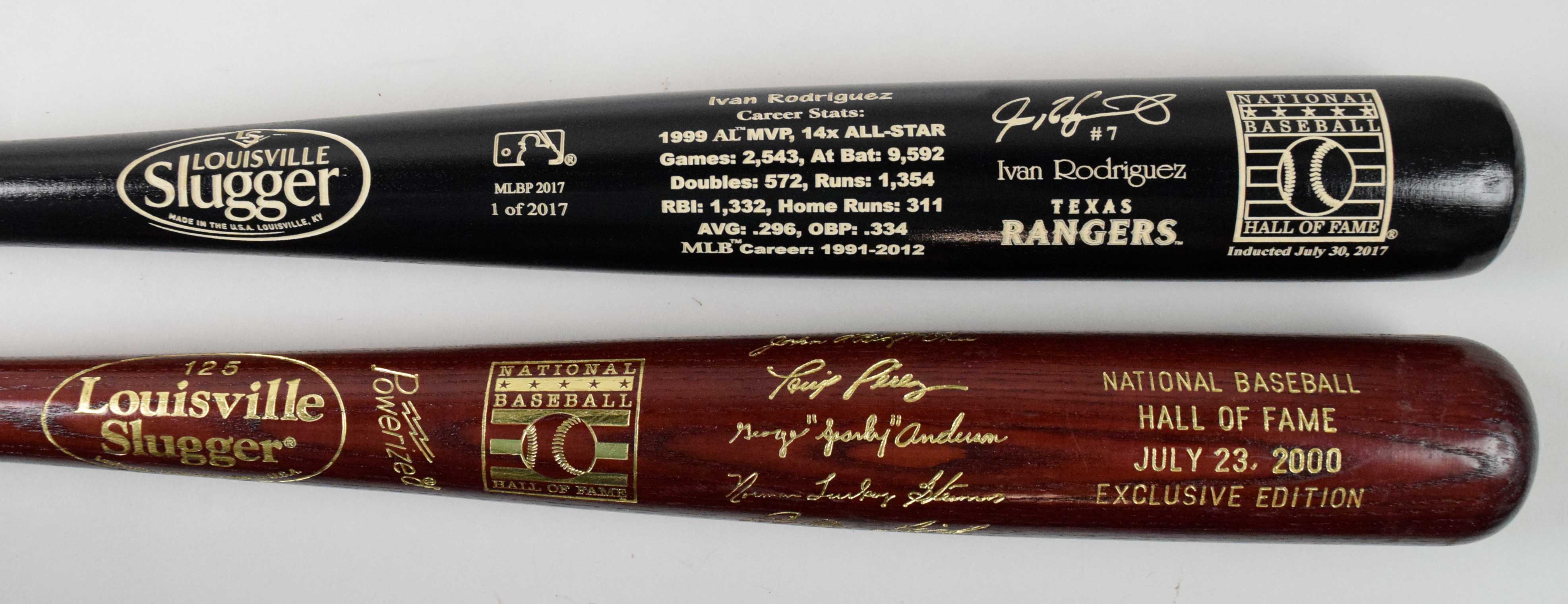 Description:Lot (2) limited edition commemerative baseball bats (NM-NM/MT) Includes 2000 bat commemorating the inductions of Tony Perez, Sparky Anderson, Carlton Fisk, Bid Mcphee, Norman Stearns (Exclusive Edition); and exclusive National Baseball Hall of Fame bat with Ivan's induction date of July 30, 2017 included as well as Ivan's career stats (#ed 1 of 2017) : NM-NM/MT