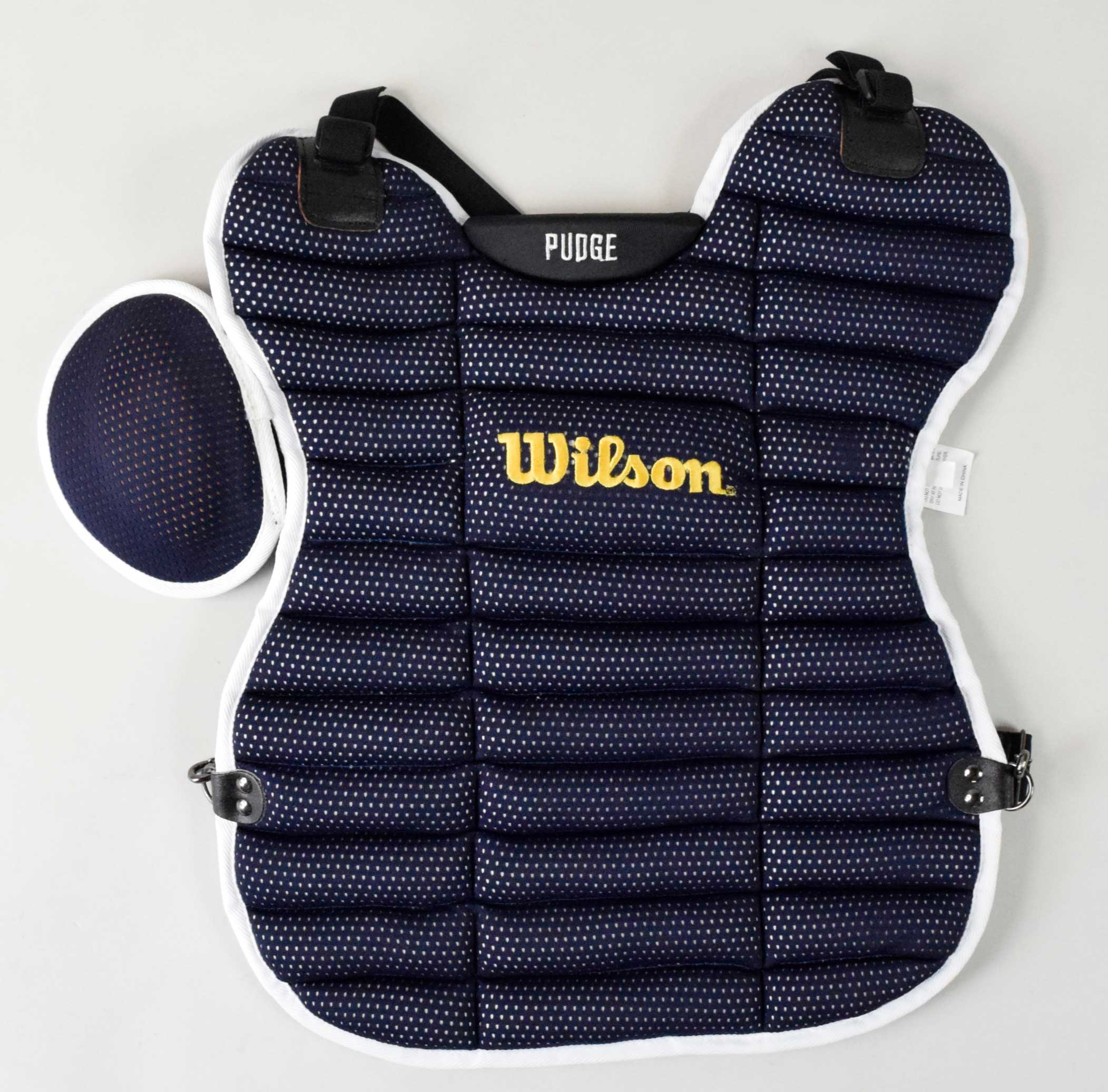 Description:Ivan Rodriguez professional model chest protector, c.2004-08 (NM unused). Wilson chest protector with "PUDGE" embroidered on the front, and right shoulder guard attached. Includes certificate of provenance from Rodriguez: NM