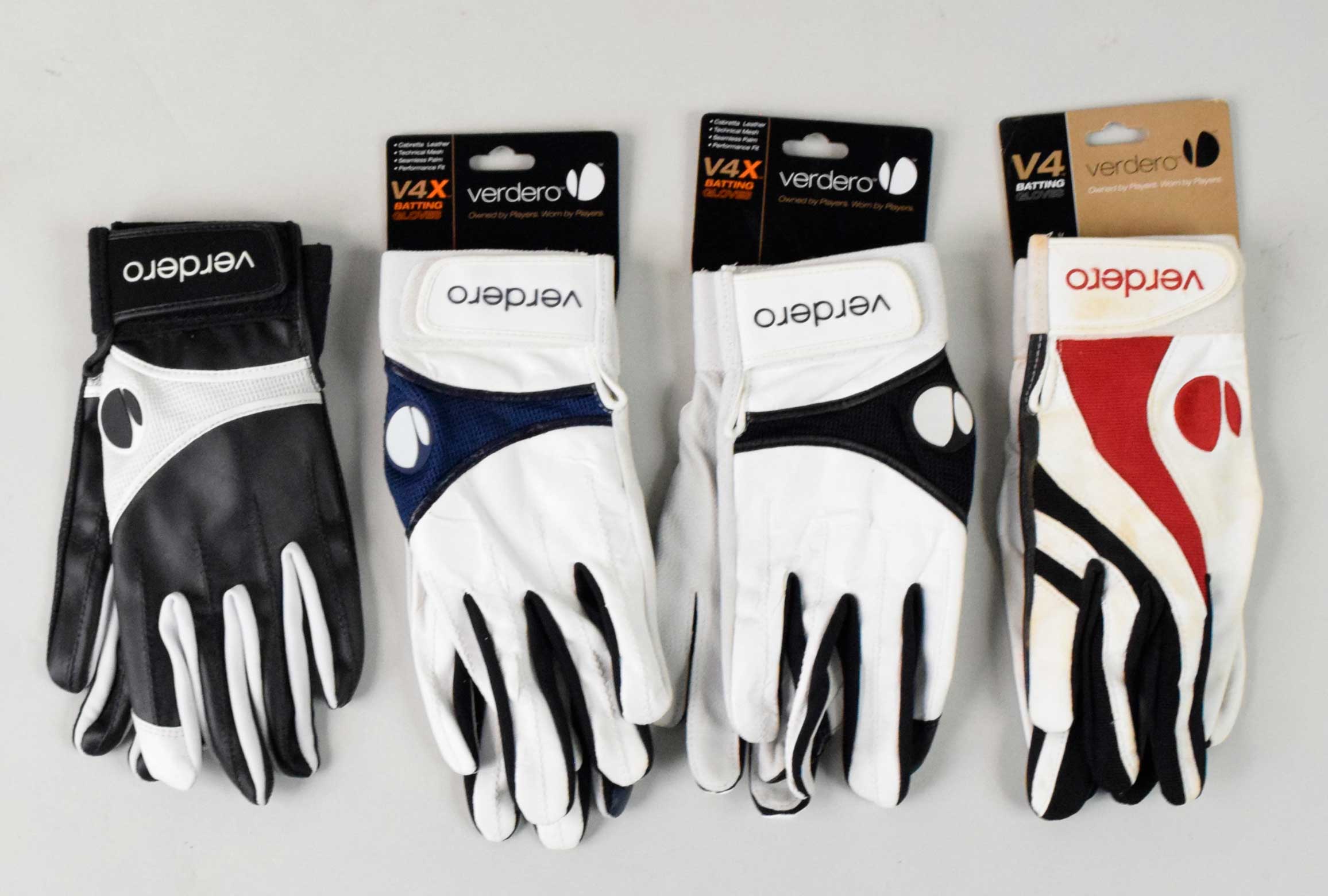 Description:Lot of (7) pairs of Ivan Rodriguez professional model batting gloves (NM-NM/MT unused). Includes (7) pairs of Verdero batting gloves. All remain in unused condition. Includes certificate of provenance from Rodriguez: NM-NM/MT