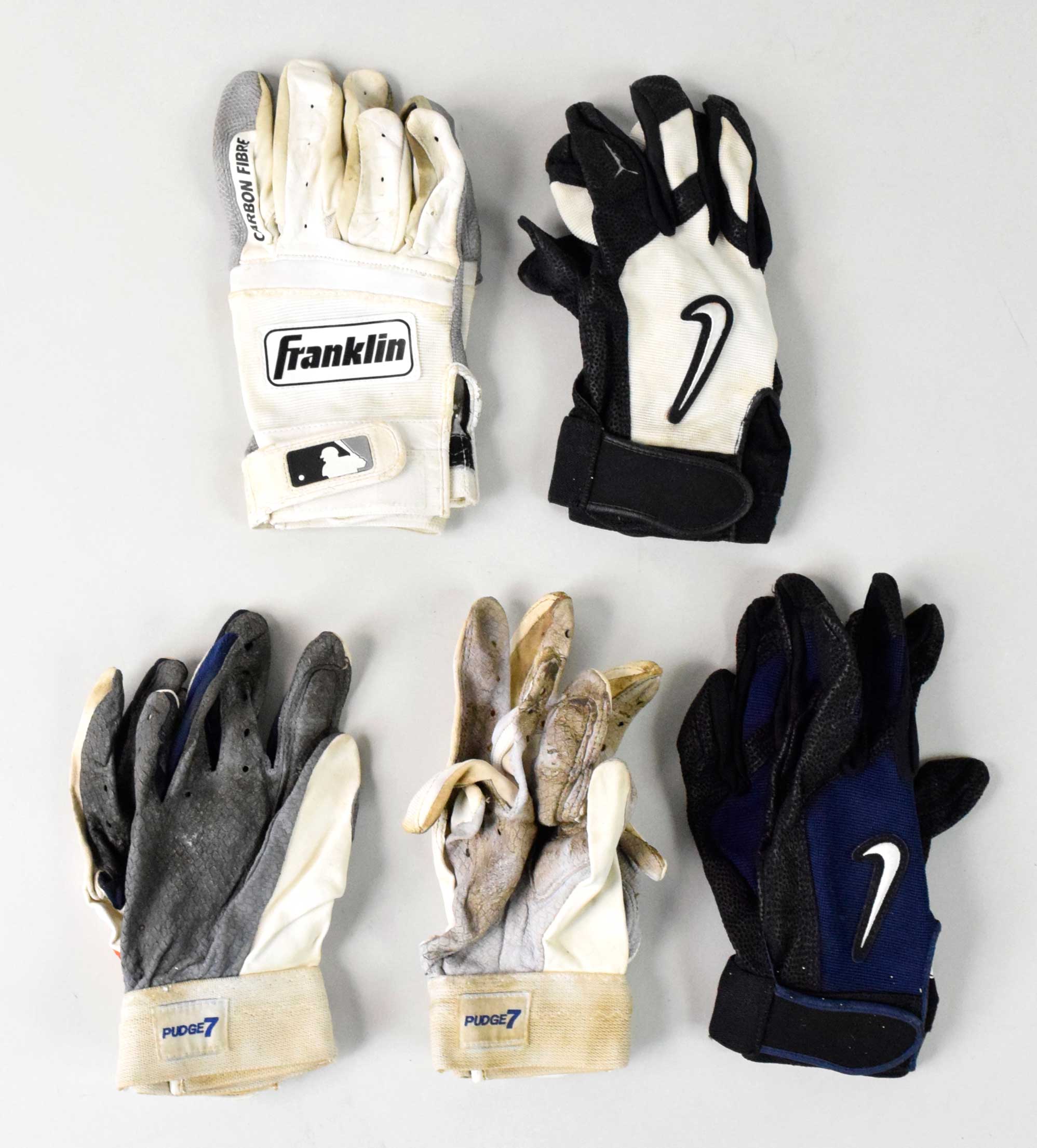 Description:Lot of (5) pairs of Ivan Rodriguez game worn batting gloves (EX-EX/MT). Includes (2) pairs of Nike batting gloves, (2) pairs of Verdero batting gloves with Pudge 7 written below the plam, and a pair of Franklin batting gloves. All show light to moderate use. Includes certificate of provenance from Rodriguez: EX-EX/MT