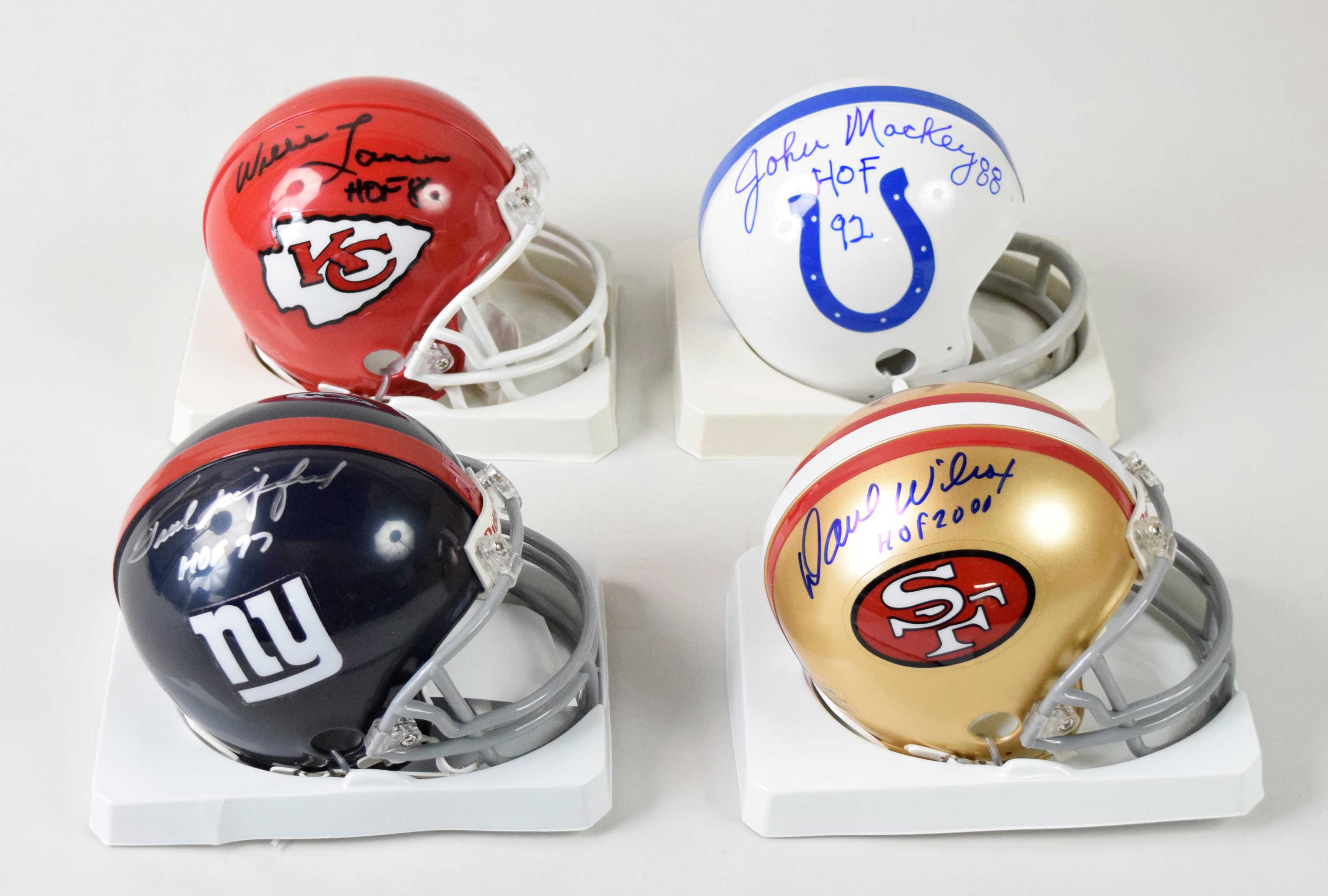 Description:Lot (5) Hall of Famers signed and inscribed mini helmets (NM-NM/MT) Includes a Vikings mini helmet signed by Randall McDaniel, a Colts mini helmet signed by John Mackey with his number "88" inscribed, a Giants signed mini helmet signed by Frank Gifford, a 49ers mini helmet signed by Dave Wilcox, and a Chiefs mini helmet signed by Willie Lanier. All players included their HOF years as an inscription. Signatures rate 8 to 10 out of 10: NM-NM/MT