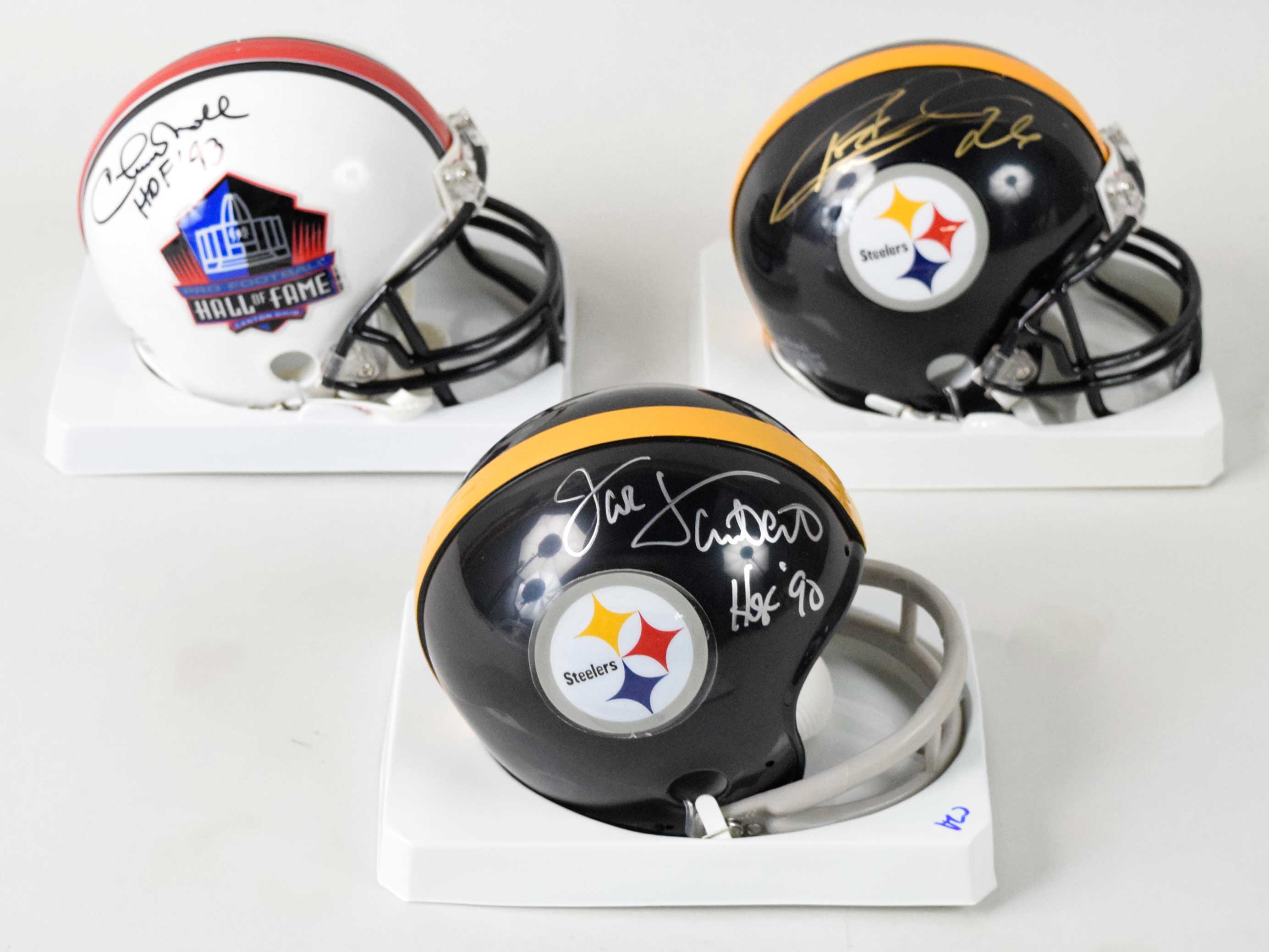 Description:Chuck Noll, Jack Lambert, and Rod Woodson signed and inscribed mini helmets (NM-NM/MT) Includes Hall of Fame mini helmet signed by Chuck Noll with "HOF 93" inscribed, a Steelers mini helmet signed by Jack Lambert with "HOF 90" inscribed, and a Steelers mini helmet signed by Rod Woodson with his number "26" inscribed. Signatures rate 7/8 to 10 out of 10: NM-NM/MT