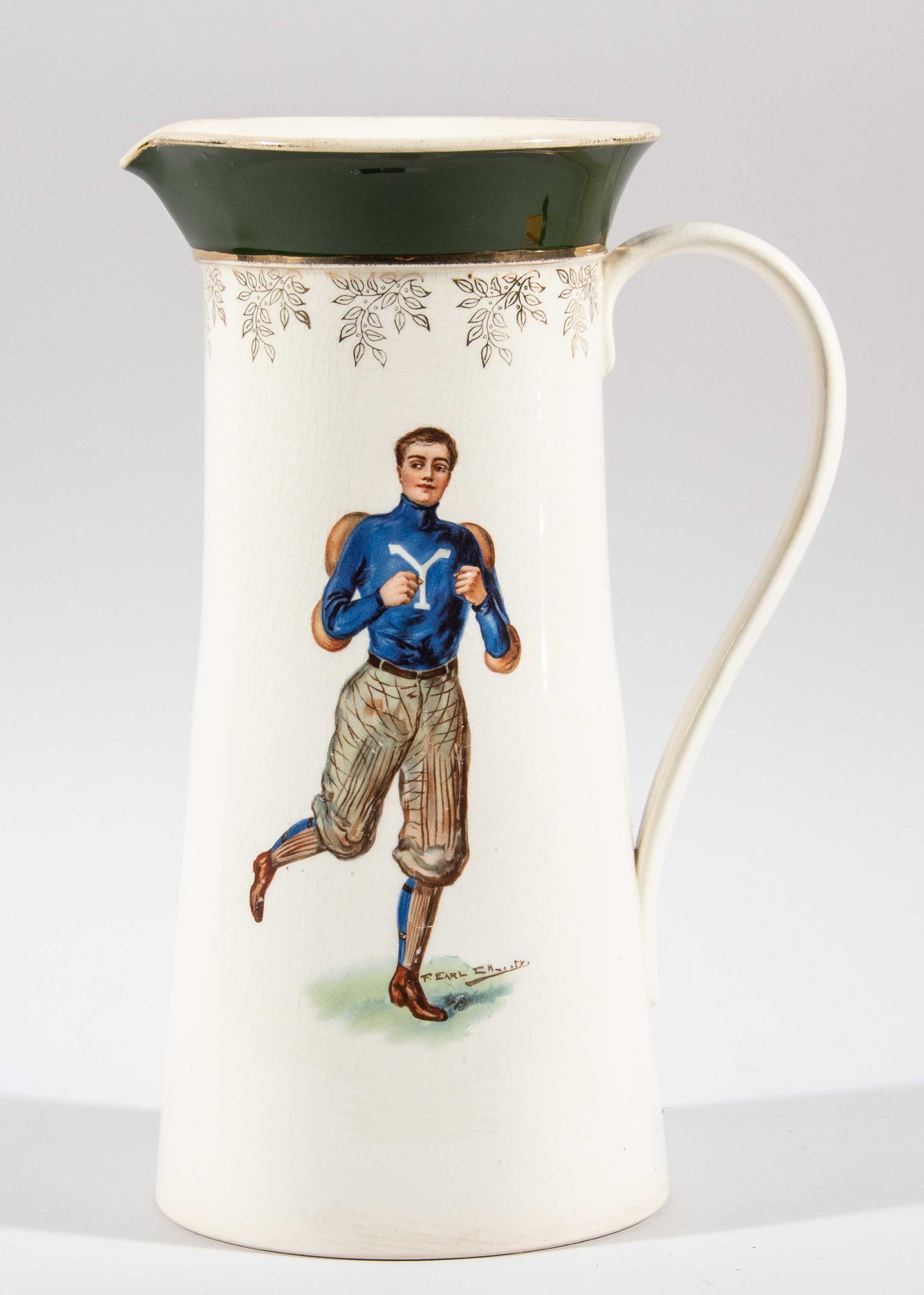 Description:Yale University football decorative porcelain water pitcher c.1905-15 (EX-MT) Large 11" tall handled porcelain water pitcher displaying uniformed Yale player on side panel by F.Earl Christy and school insignia on the back. Very fine general condition with Avon WM hallmark on bottom: EX-MT ($200-$400)
