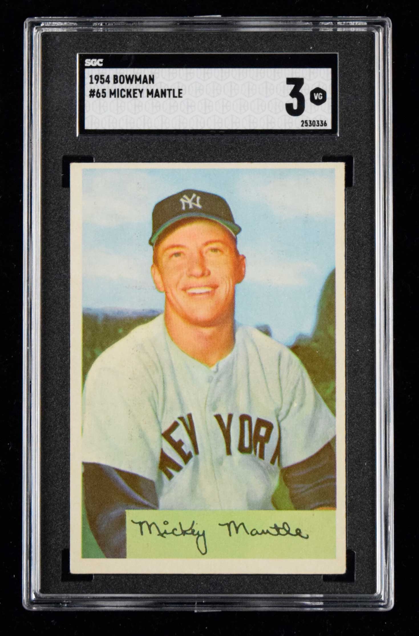 1954 Bowman #65 Mickey Mantle (SGC 3 VG) Touch of light wear with a minor crease to extreme lower right corner: SGC 3 VG ($750-$1,250)