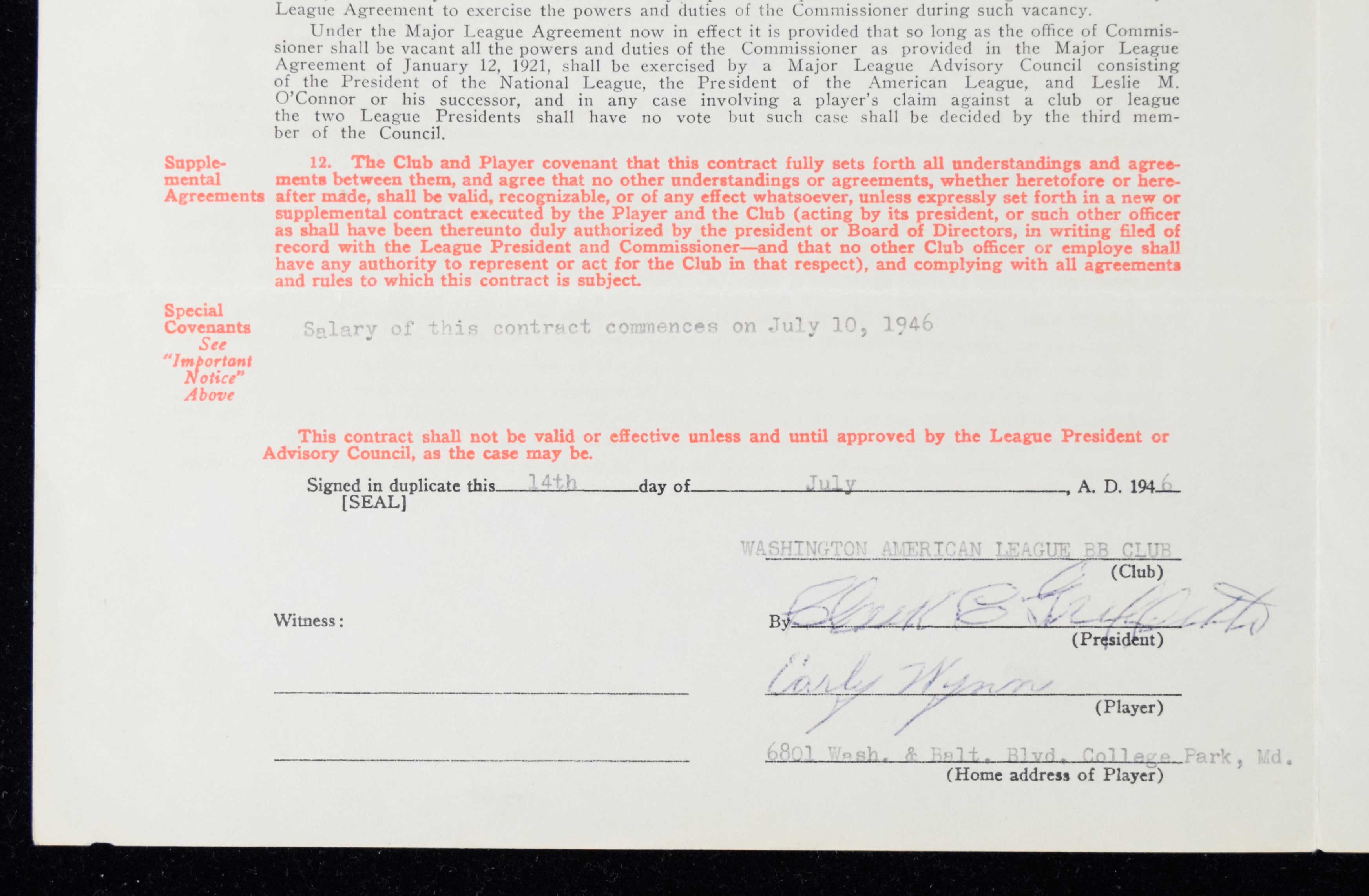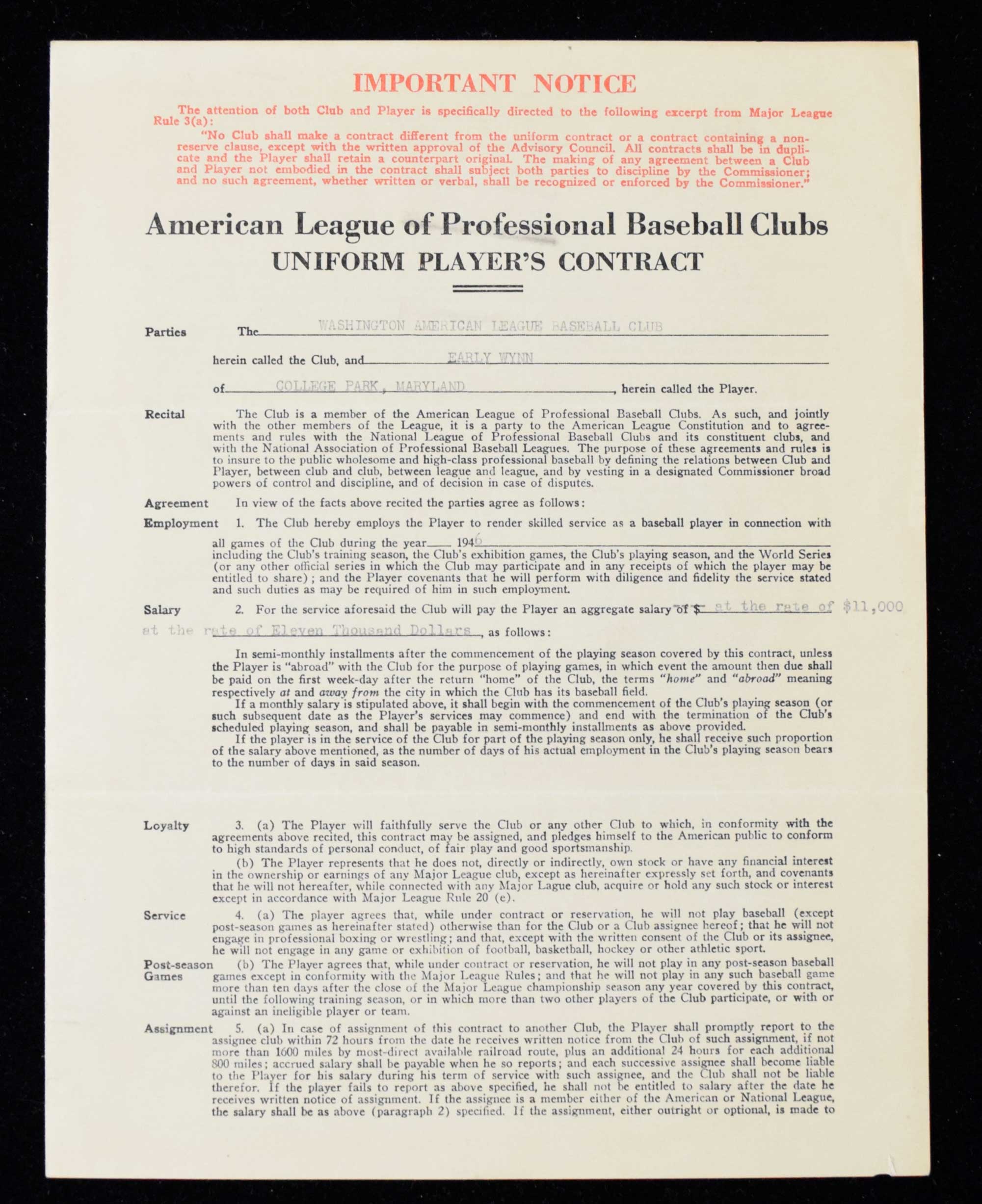Description:1946 Early Wynn Washington Senators player's contract - signed by Wynn, Clark Griffith, and Will Harridge (Sigs. EX-NM, Contract EX-EX/MT) American League Uniform Player's Contract issued to Wynn for the 1946 season has been signed inside "Early Wynn" and "Clark Griffith." These are done in ink rating 6/7 out of 10. Also signed on the back by League President Harridge in fountain pen rating 8/9 out of 10. Typical fold lines and some other light wear which includes a small piece of tape affixed to the inside: Sigs. EX-NM, Contract EX-EX/MT ($1,000-$3,000)