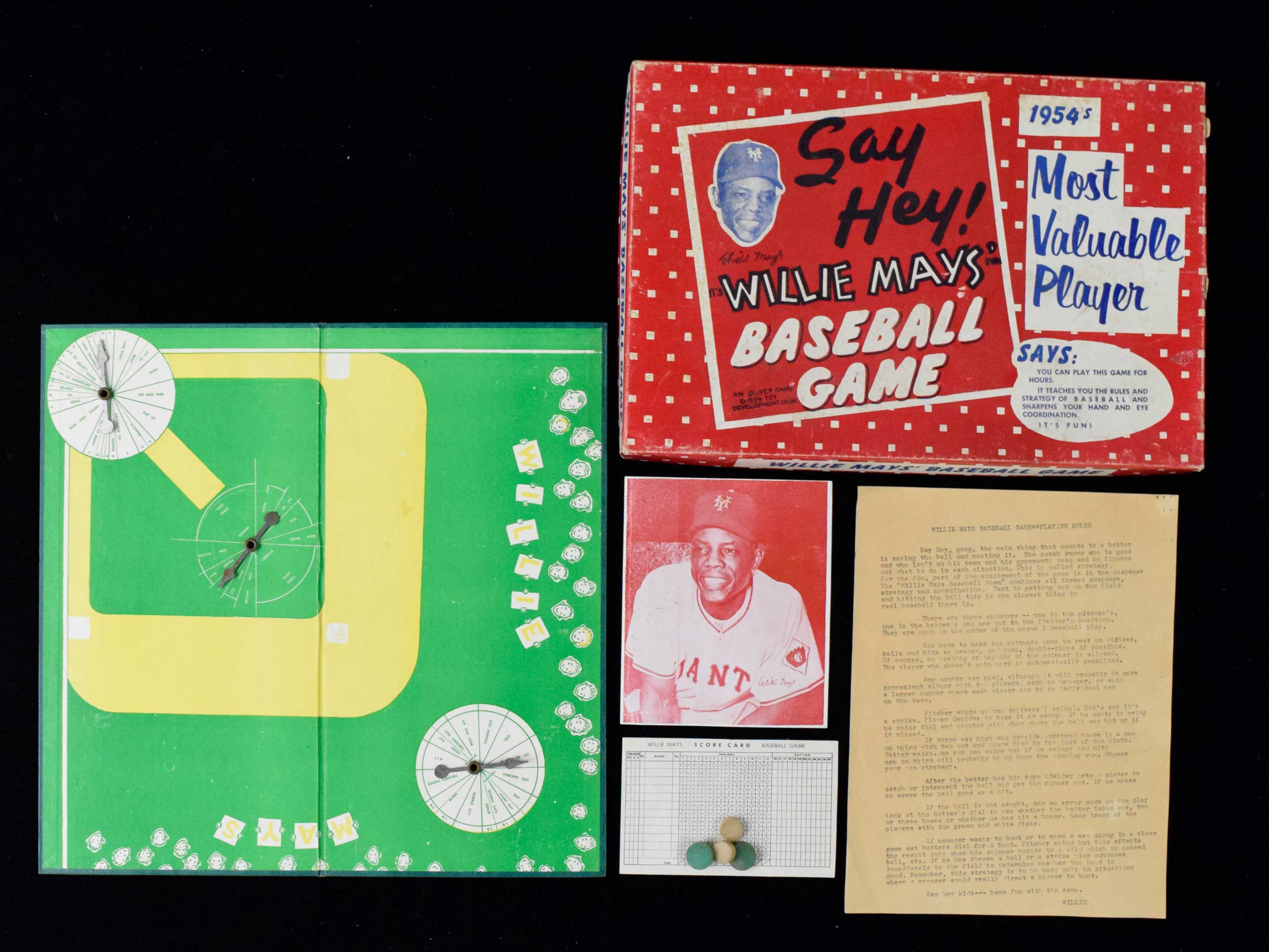 Description:c.1954 "Willie Mays Say Hey! Baseball Game" with original pieces and rare premium (VG-EX) Desirable game which has Mays pictured on the box includes the playing board, scorecard, (4) playing pieces, rules sheet, and the rare photo premium of Willie. Box has some general handling and storage wear including a few wrinkles/creases, scuffs, and there is a tear to one side flap. Contents show some light wear however the scorecard has not been filled out. Rules sheet has handwriting on the back. Photo premium has some wrinkles and an upper left corner crease: VG-EX ($500-$750)