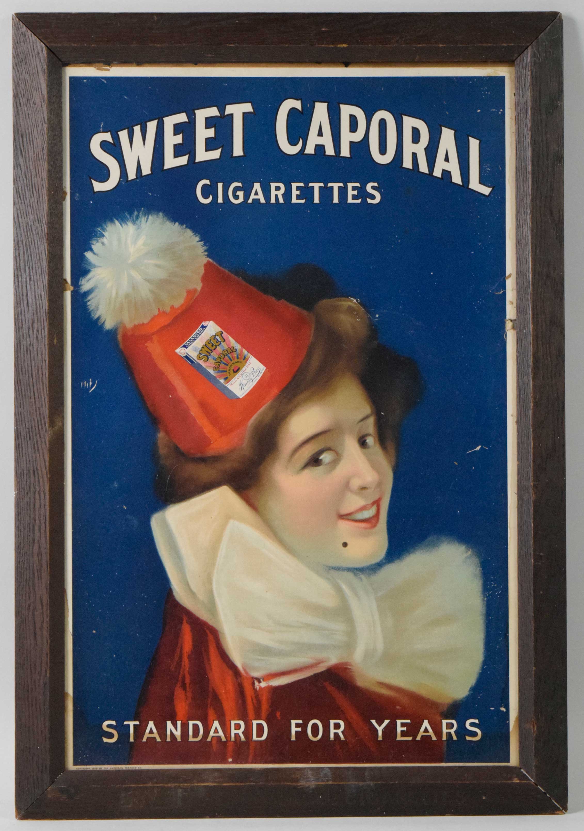 Description:c.1910s Sweet Caporal Cigarettes advertising sign in original frame (VG) Vintage advertising piece shows mild scattered wear and is displayed in an older (22"x32") wooden frame. Frame has "Sweet Caporal Cigarettes" text impressed along the lower edge: VG ($300-$500)
