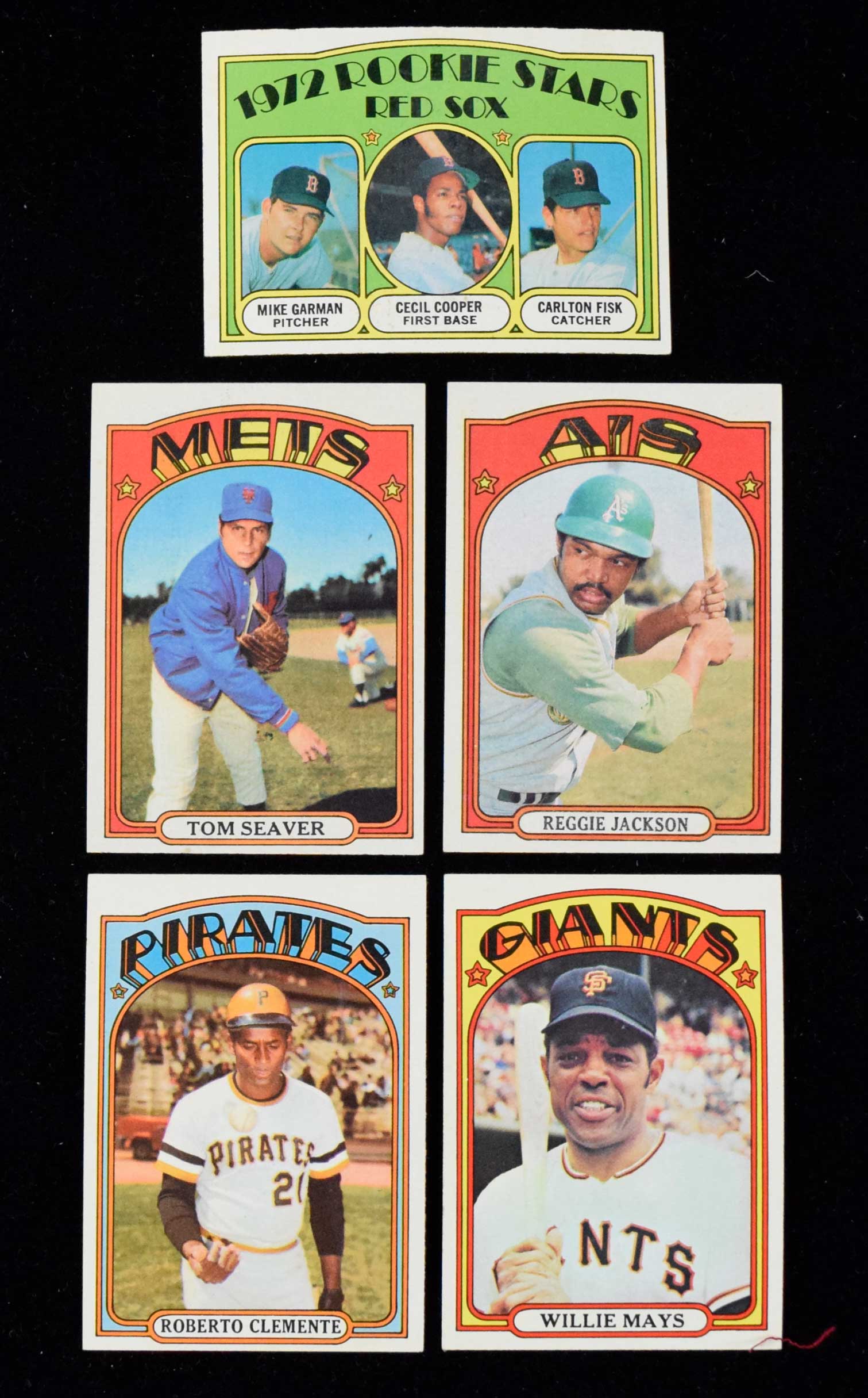 Description:Very nice 1972 Topps Baseball near complete set (784 of 787 cards) (Avg. EX-EX/MT) Nice set overall with average card around EX-EX/MT and there are a good portion better. As is common to 72 Topps, centering can be an issue. Keys: #49 Mays (EX/MT appearance, small mark on back), 79 Fisk (EX-EX/MT), 299 Aaron (VG/EX-EX), 309 Clemente (EX/MT OC), 433 Bench (GD), 435 Jackson (EX/MT OC), 441 Munson (discoloration along top edge), 445 Seaver (EX/MT-NM OC), 550 Robinson (EX), 559 Rose (discoloration along top edge), 595 Ryan (EX/MT OC), 600 Kaline (EX/MT-NM), 686 Garvey (EX/MT OC), 695 Carew (EX OC), 751 Carlton (VG/EX-EX), 752 Morgan (EX-EX/MT OC), 754 Robinson (EX OC), and 761 Oglivie/Cey (EX). Missing 526, 560, 619, and 621: Avg. EX-EX/MT ($1,000-$1,500)