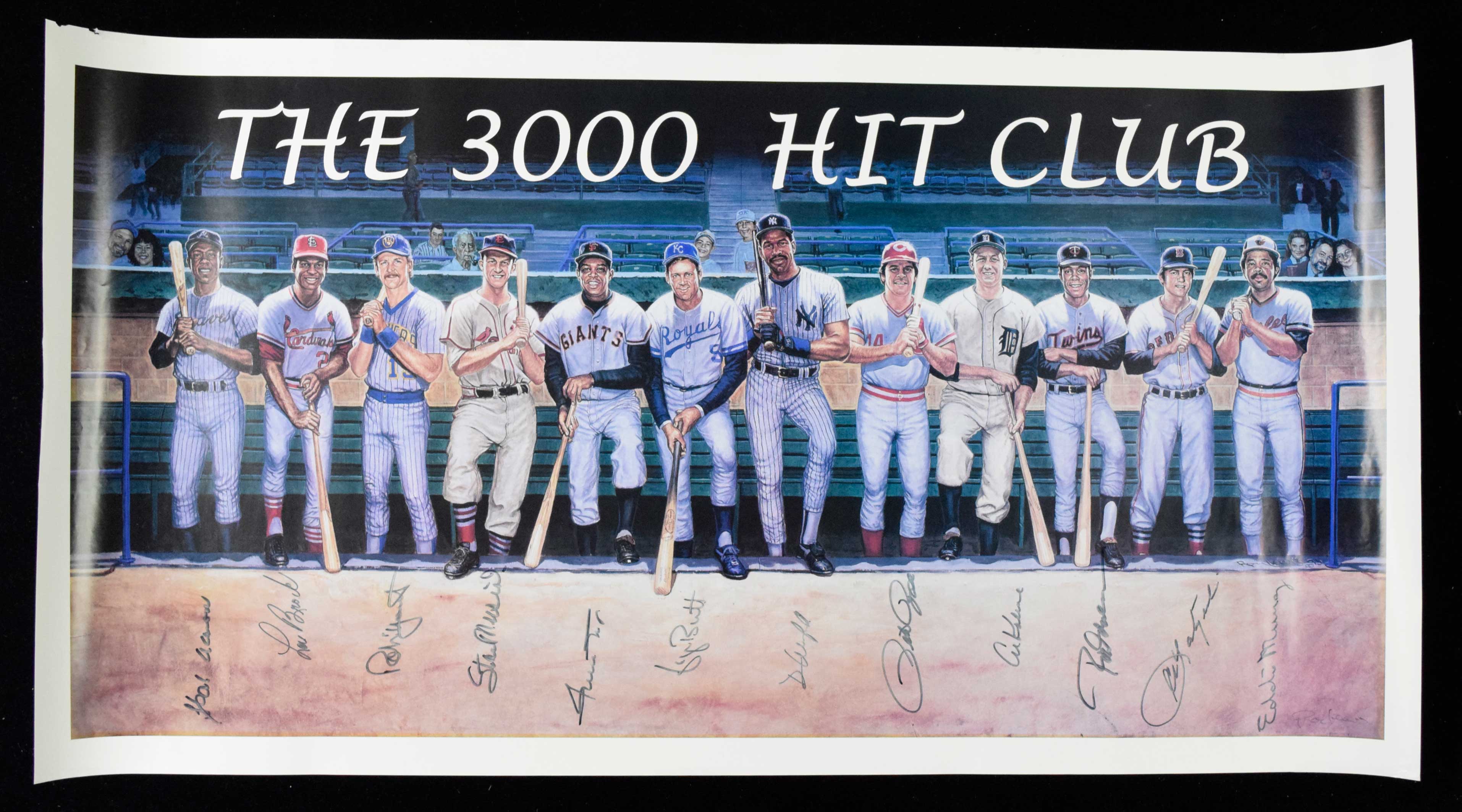 Description:3,000 Hit Club autographed poster - (12) signatures incl. Mays and Aaron (EX-NM) Large format print has been signed by (12) incl. Aaron, Mays, Brock, Yount, Musial, Brett Winfield, Rose, Kaline, Carew, Murray, and Yastrzemski. Blue marker signatures rate 7 to 8 out of 10. Touch of light wear would not have effect when matted and framed for display. Measures approx. 19.75"x37.5": EX-NM ($500-$750)