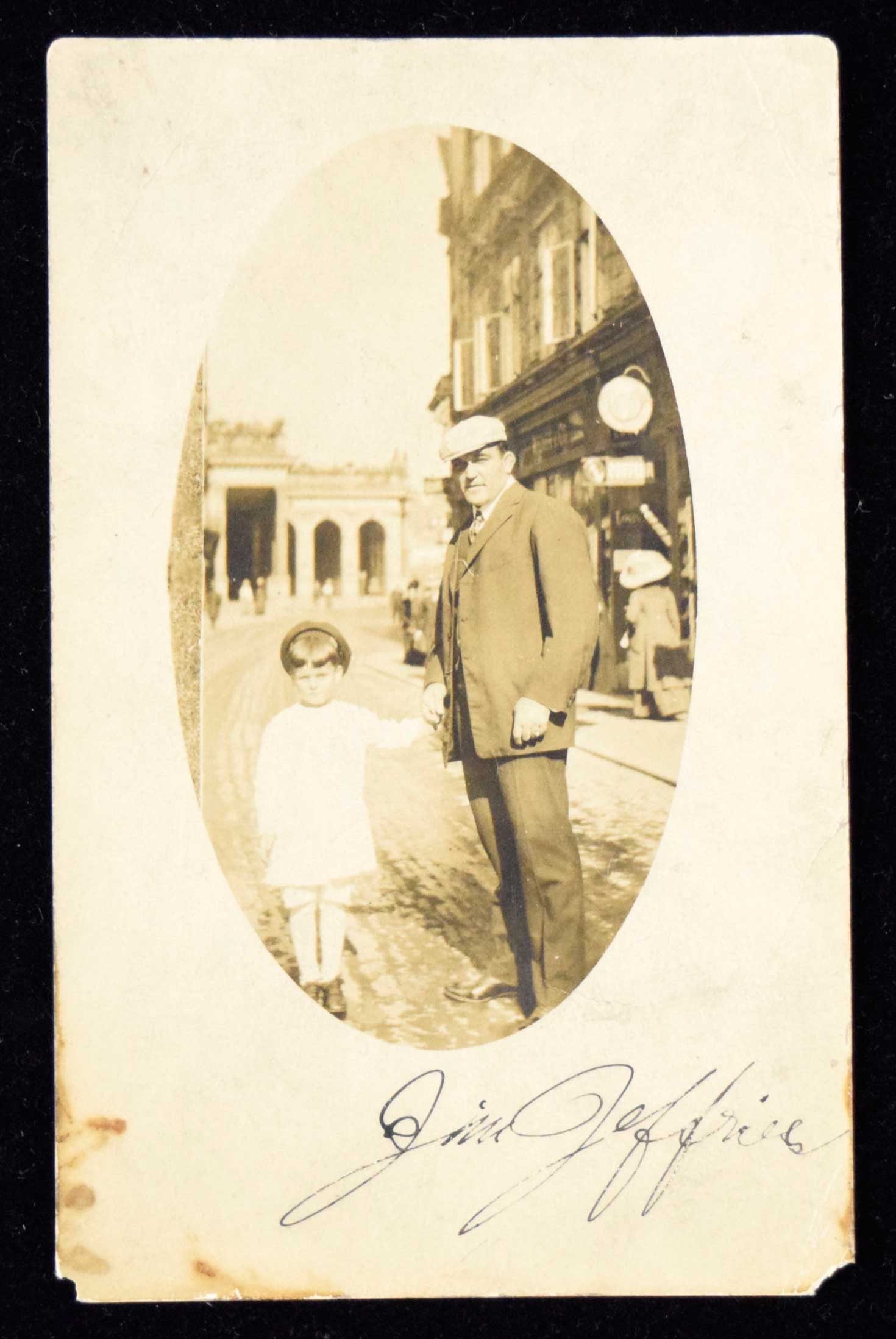 Description:Jim Jeffries autographed real photo postcard (full JSA LOA) (Sig. EX-EX/MT, Postcard GD/VG) Sepia toned real photo postcard has been signed along the lower front edge in fountain pen rating approx. 7 out of 10. Scattered wear includes some minor wrinkles/creases, discoloration, and a chip to one corner. Includes full LOA from JSA: Sig. EX-EX/MT, Postcard GD/VG ($500-$750)