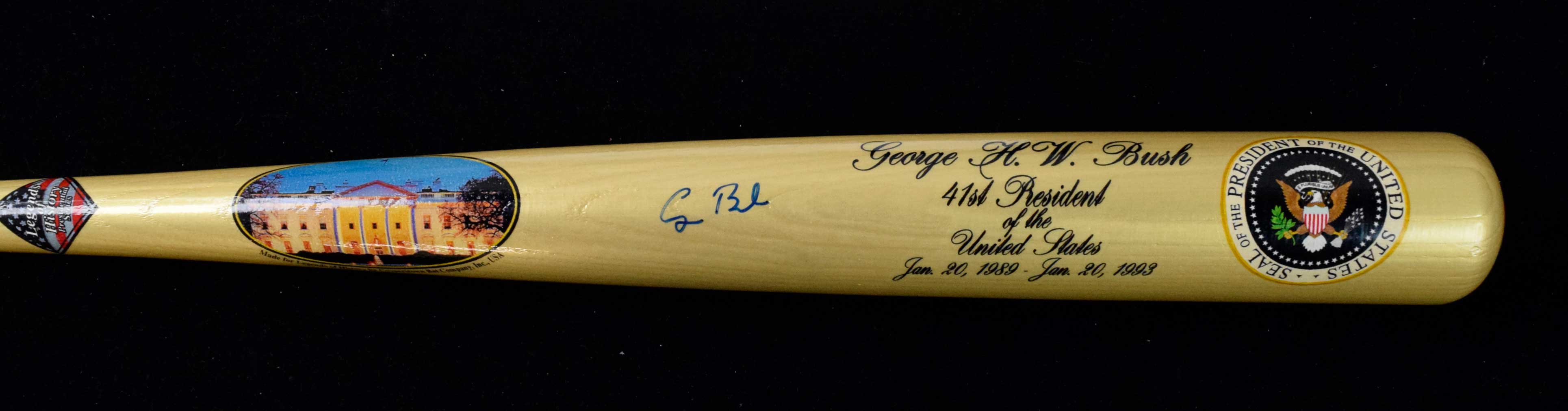Description:President George H.W. Bush autographed limited edition baseball bat (NM) Gold colored bat with applied decals which include an image of The White House, text/titling, and the seal of the President. Signed "George Bush" in marker rating 8 out of 10. Includes original documentation from one of the well known Patrick Van Tiem organized signings and his hologram is affixed. Numbered "21/89" in the knob: NM ($750-$1,500)