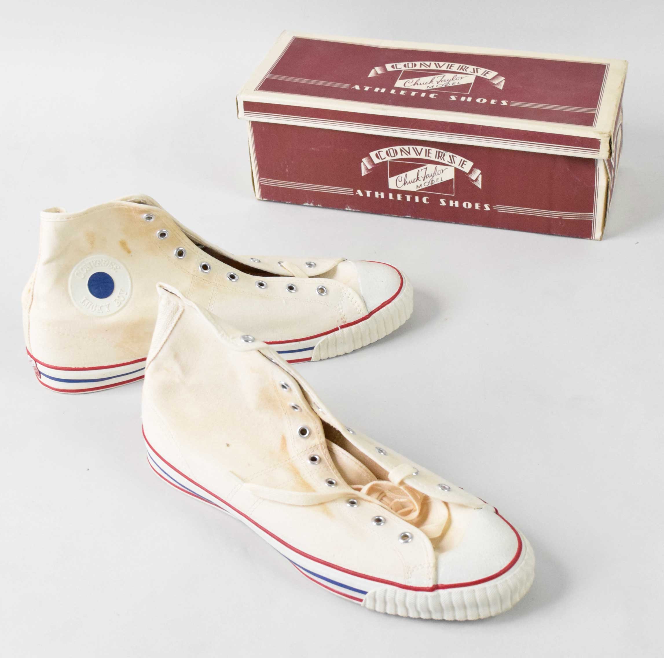 Description:New in box c.1960s Converse Chuck Taylor "Lucky Boy" sneakers (Box VG/EX, Sneakers NM) Pair of unused size (11.5) sneakers are in "like new" condition with just a touch of light toning. Box has some general storage wear: Box VG/EX, Sneakers NM ($300-$500)