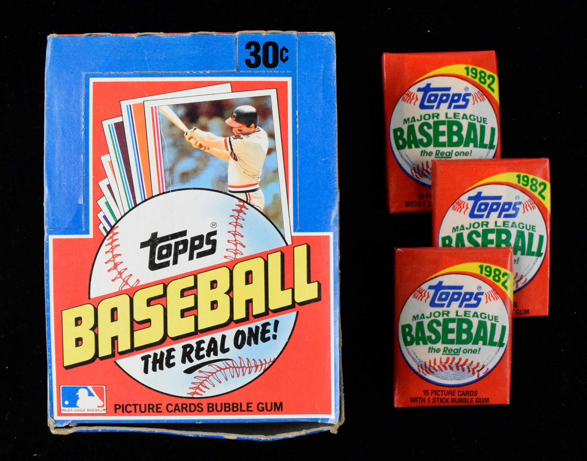 Description:1982 Topps Baseball complete box of (36) unopened wax packs (EX-NM) Original store display box shows some light handling and storage wear. Packs are generally EX/MT or better: EX-NM ($500-$1,000)