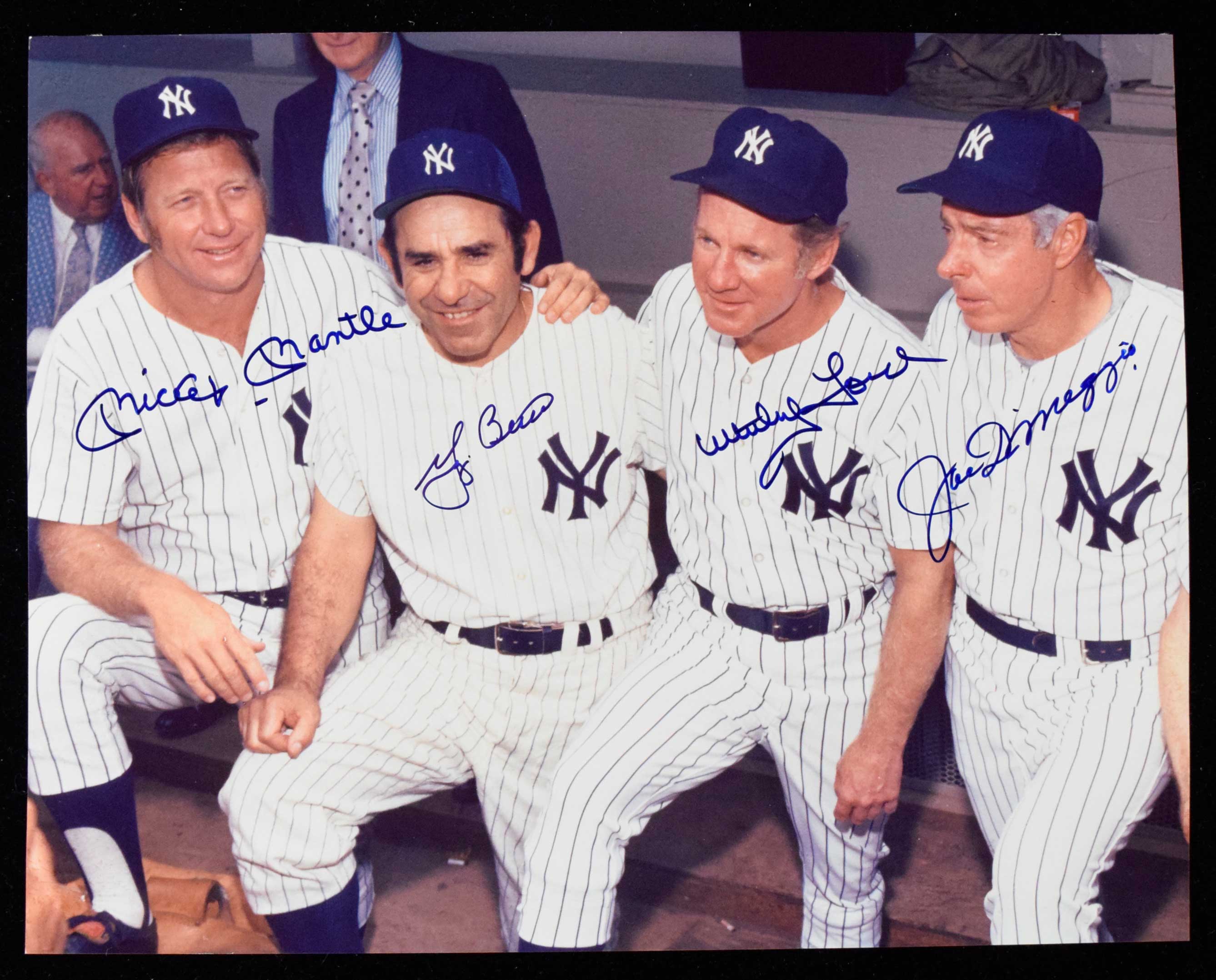 Description:Mickey Mantle, Joe DiMaggio, Yogi Berra, and Whitey Ford signed 11"x14" photograph (NM) Color photo has been signed by all (4) in marker rating 9 to 9/10 out of 10. Two small pieces of archival tape on the back are from prior mounting and mentioned for accuracy: NM ($750-$1,250)