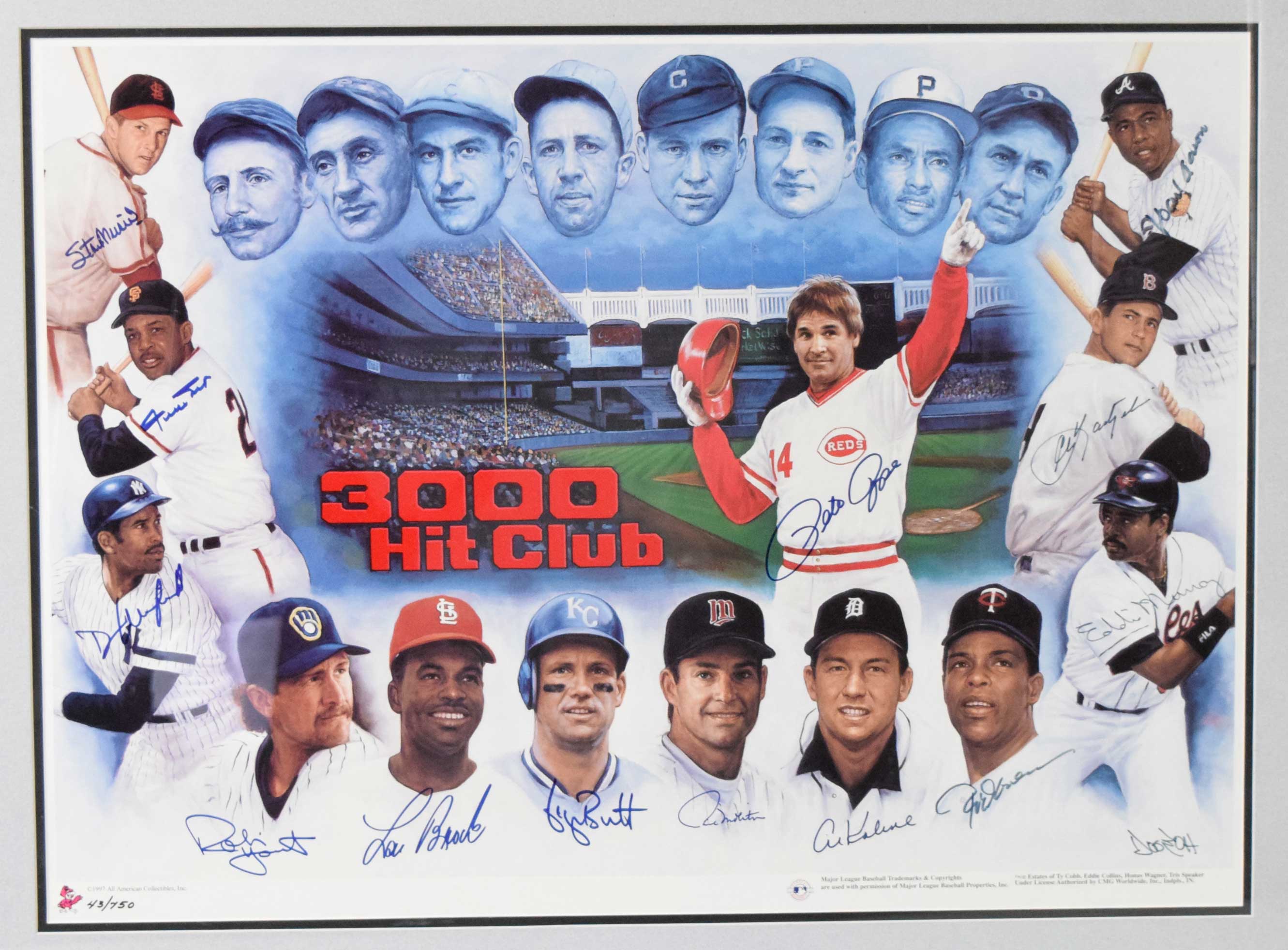 Description:3,000 Hit Club autographed limited edition print (NM) Large format print (framed to 37.5"x29.5") has been signed by (13) incl. Aaron, Mays, Rose, Musial, Yastrzemski, Murray, Molitor, Brett, Yount, Winfield, Carew, Brock, and Kaline. All are done in marker rating 8 to 9 out of 10. Also signed by the artist and numbered out of (750) pieces. Includes documentation related to the 1997 event at which it was signed: NM ($500-$1,000)