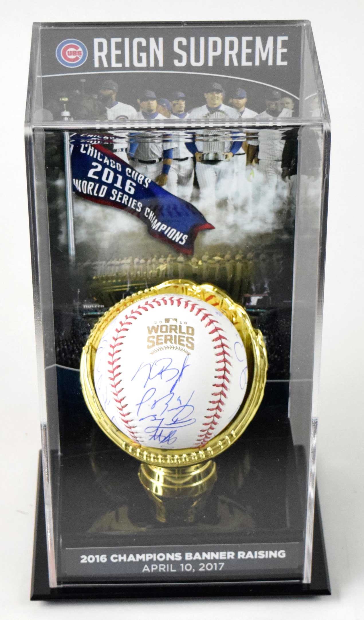 Description:2016 Chicago Cubs team signed World Series logo baseball (in display case) (MLB/Fanatics) (NM) Rawlings Official 2016 World Series game logo ball has been signed by (20) incl. Addison Russell, Albert Almora, Anthony Rizzo, Aroldis Chapman, Ben Zobrist, Chris Coghlan, CJ Edwards, Dexter Fowler, Hector Rondon, Javier Baez, Jon Lester, Justin Grimm, Kris Bryant, Kyle Hendricks, Miguel Montero, Mike Montgomery, Pedro Strop, Wilson Contrearas, Kyle Schwarber, and David Ross. All are done in ink rating 8 to 9/10 out of 10. MLB (JC064747) and Fanatics authentication holograms affixed. Includes lucite display case: NM ($500-$750)