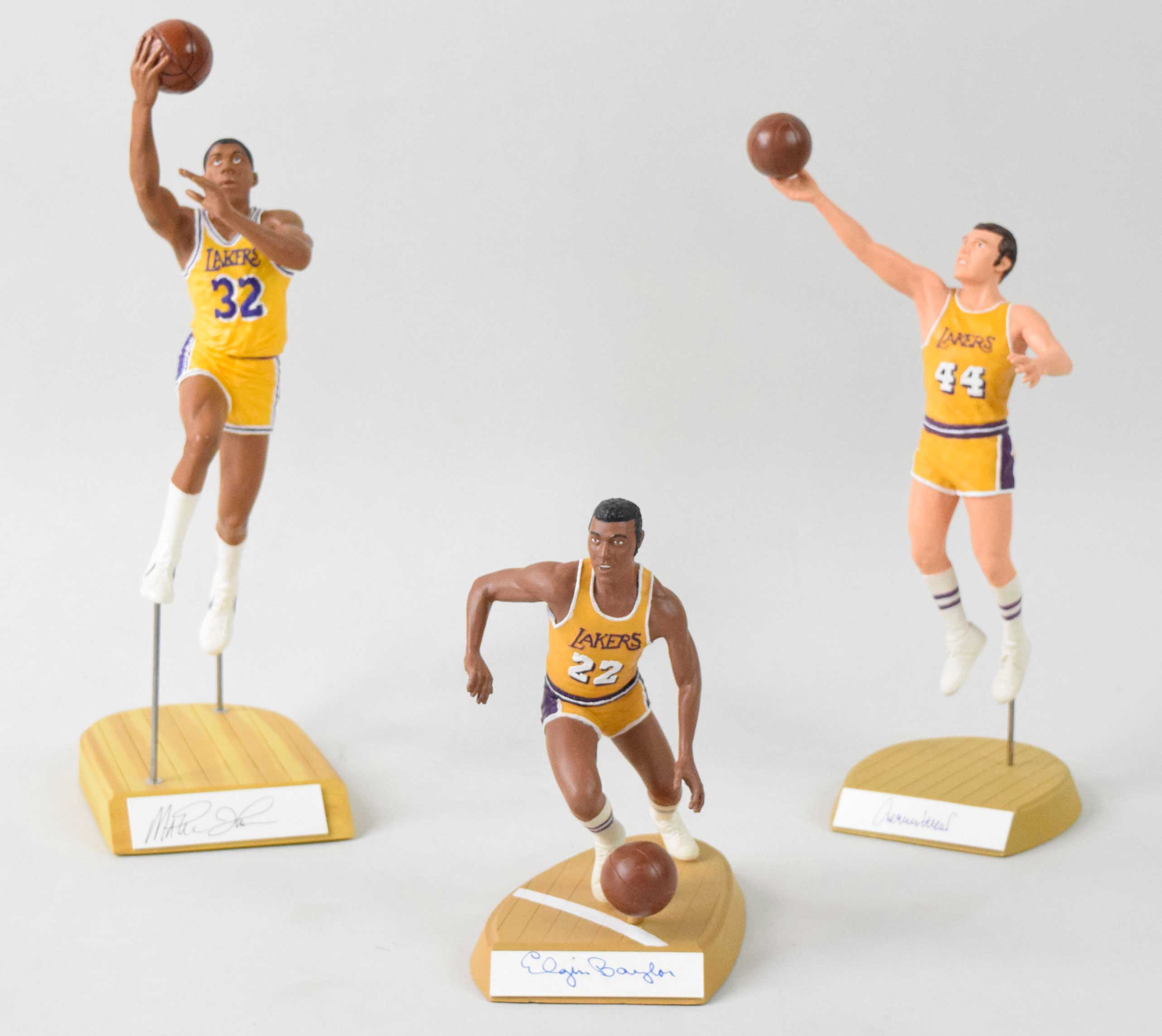 Description:Elgin Baylor, Jerry West, and Magic Johnson signed limited edition Salvino statues (NM overall). Includes 1991 statue signed by Elgin Baylor (#ed 390/700), 1991 statue signed by Jerry West (#ed 135/700), and 1994 statue signed by Magic Johnson (#ed 33/950). Signatures rate 8/9 to 9/10 out of 10: NM overall
