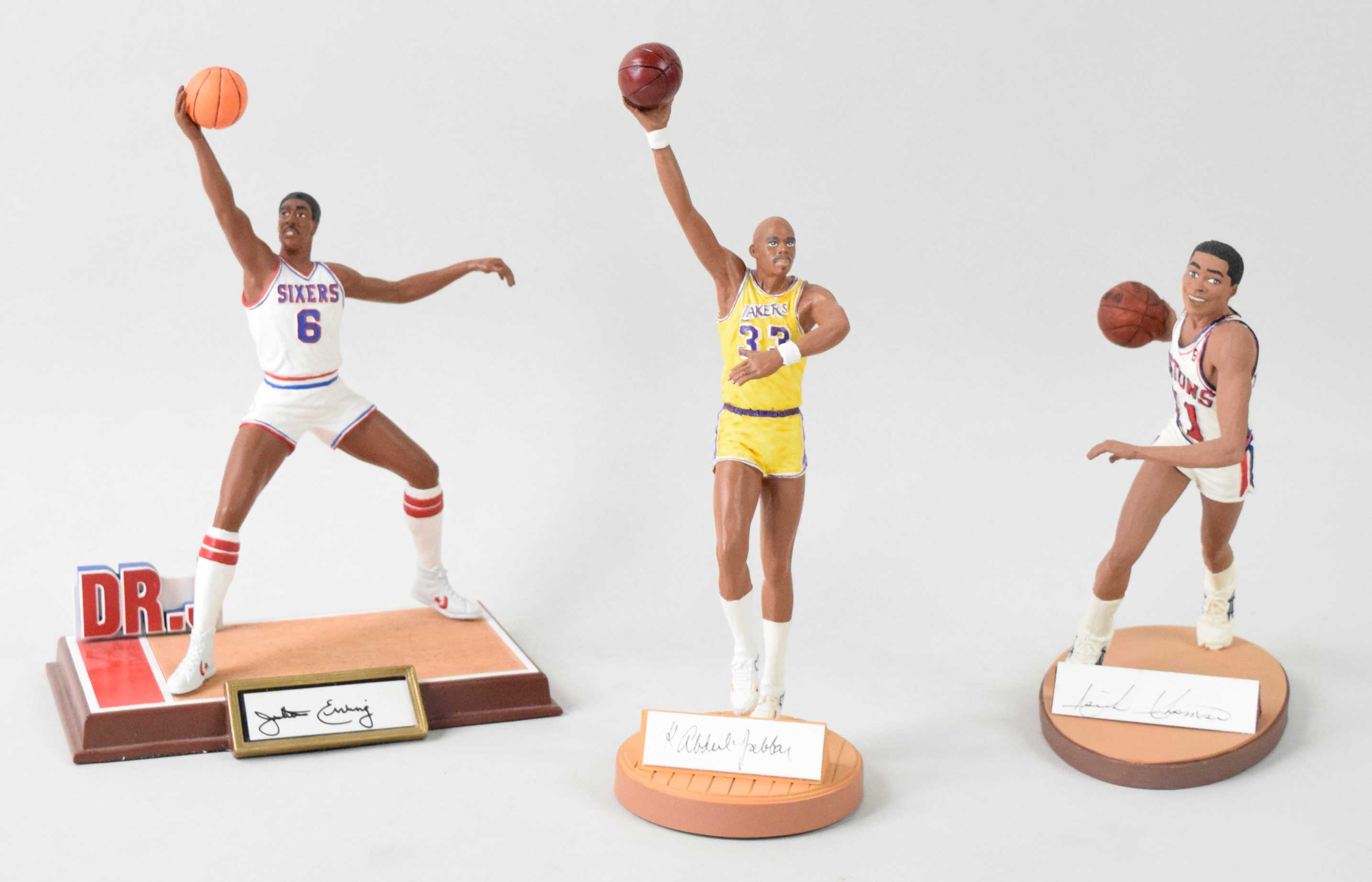 Description:Julius Erving, Kareem Abdul-Jabbar, and Isiah Thomas signed limited edition statues (NM overall). Includes 1989 Gartlan statue signed by Kareem Abdul-Jabbar (#ed 1971/1989, missing goggles); 1991 Gartlan statue signed by Isiah Thomas (#ed 247/1990); and 1993 Sports Impressions statue signed by Julius Erving (#ed 113/975). Signatures rate 7/8 to 9/10 out of 10: NM overall, with note to missing goggles