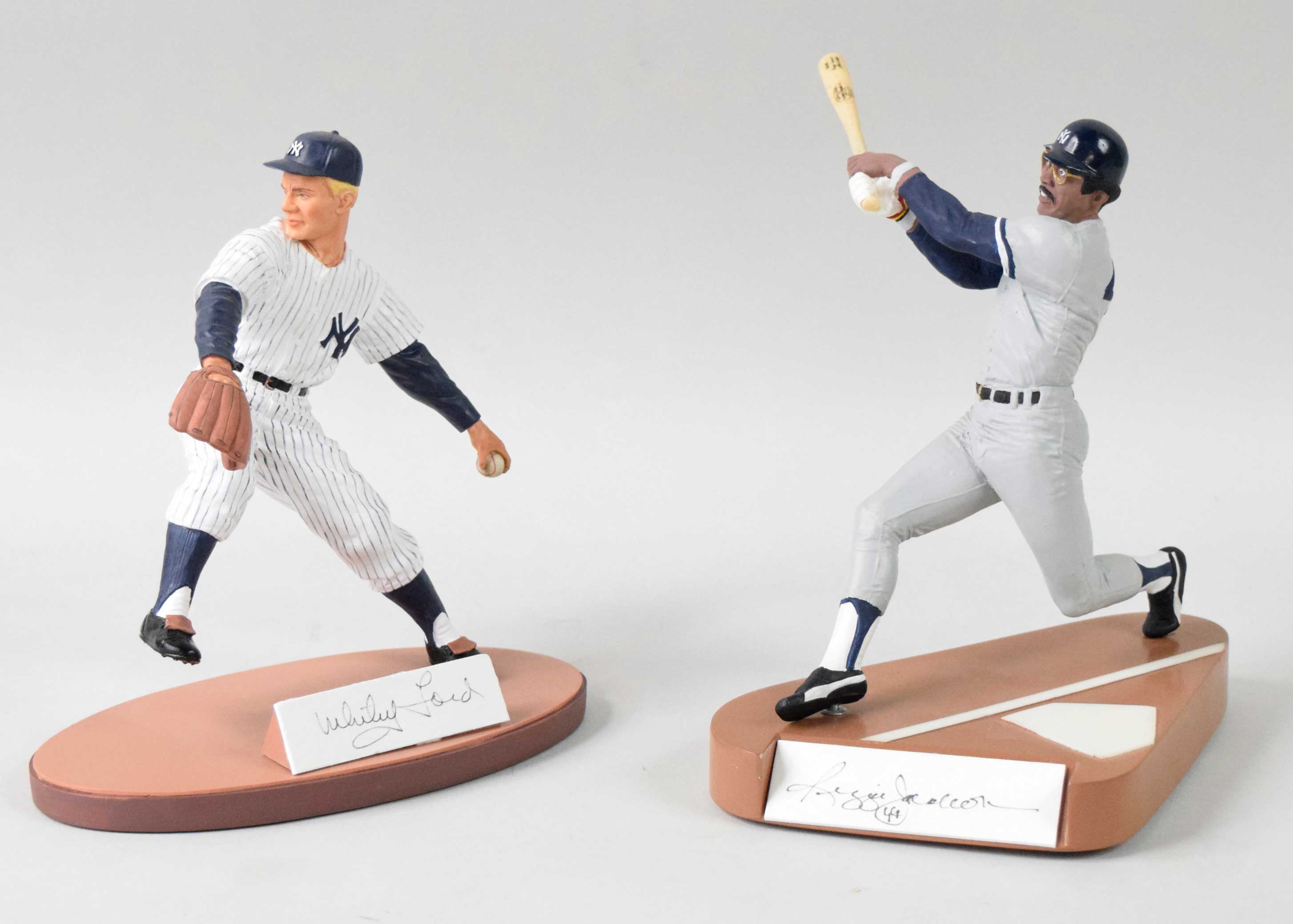 Description:Whitey Ford and Reggie Jackson signed limited edition statues (see description). Includes 1990 Gartlan statue signed by Whitey Ford (#ed 988/2360), and 1994 Salvino statue signed by Reggie Jackson (#ed 334/1500, also Upper Deck Authenticated, brim of helmet chipped off)). Signatures rate 7/8 to 8 out of 10.