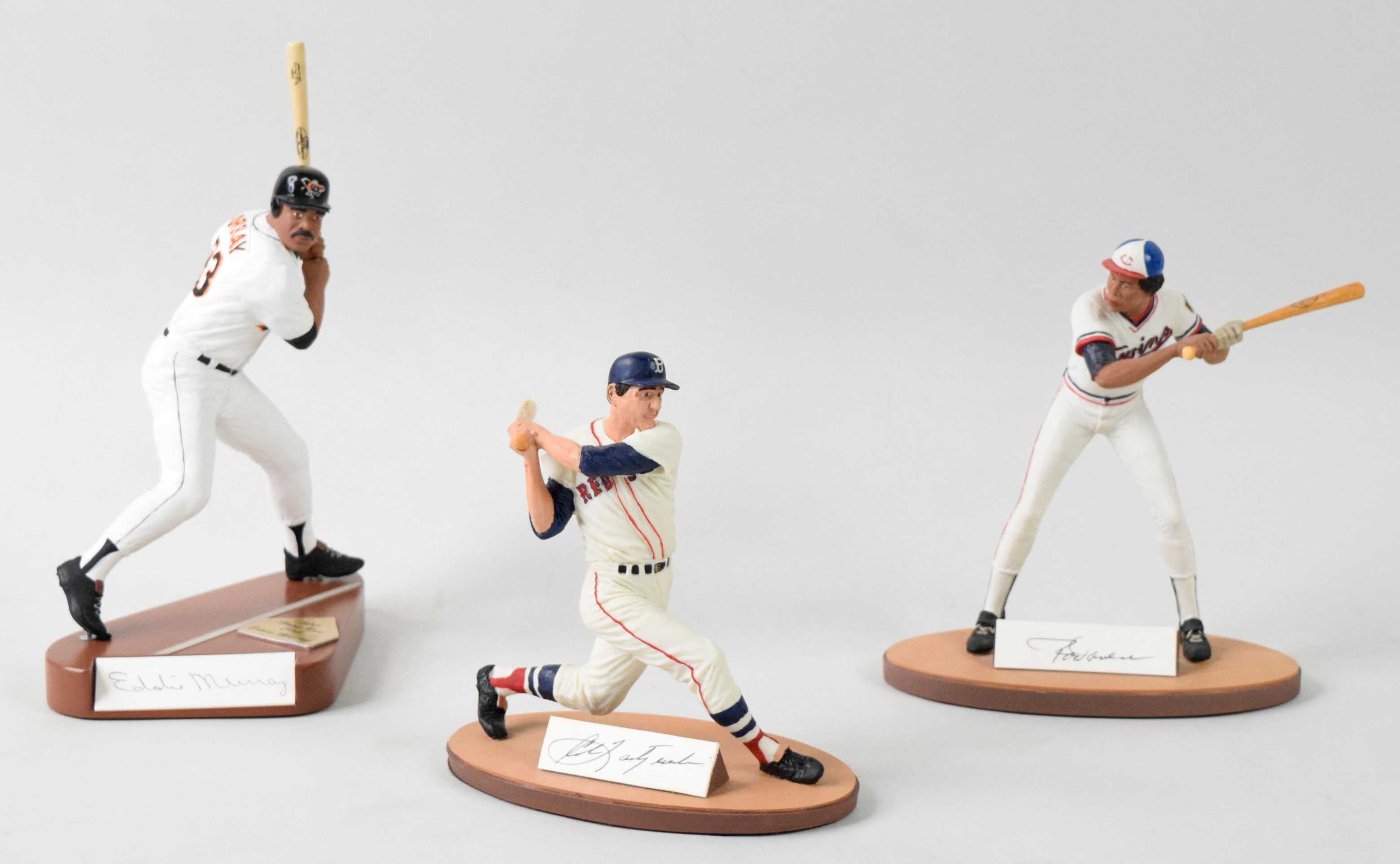 Description:Rod Carew, Carl Yastrzemski, and Eddie Murray signed limited edition statues (NM overall). Includes 1989 Gartlan statue signed by Carl Yastrzemski (#ed 1845/1989), 1991 Gartlan statue signed by Rod Carew (#ed 399/1991), and 1996 Salvino statue signed by Eddie Murray (#ed 188/950). Signatures rate 8 to 9 out of 10: NM overall