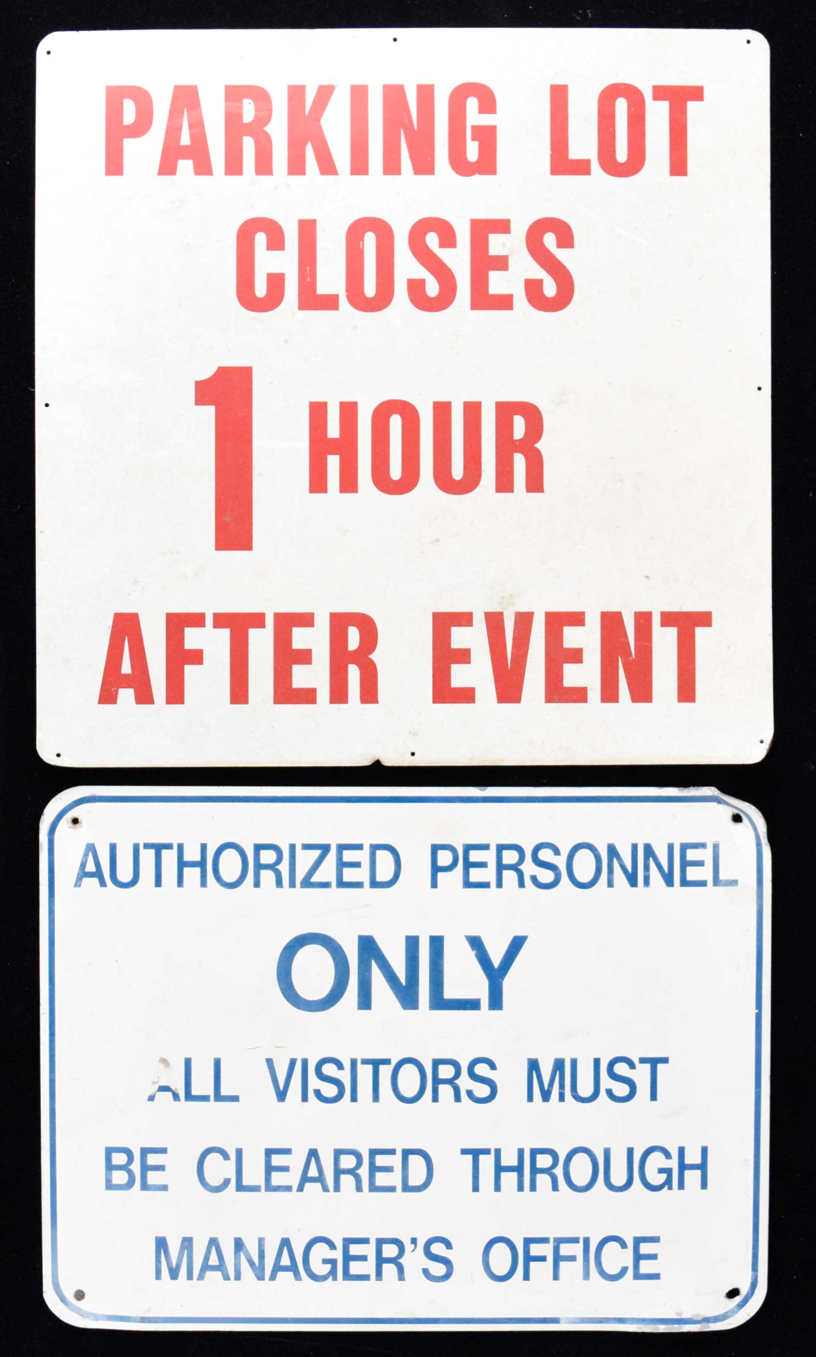Description:Lot of (2) Veterans Stadium and Valley Forge Music Fair exterior signs (EX). Includes 18"x24" metal Authorized Personnel sign from the backstage door of the Valley Forge Music Fair, and 24"x24" metal Parking Lot sign from Veterans Stadium. Normal wear from extended use and removal: EX overall