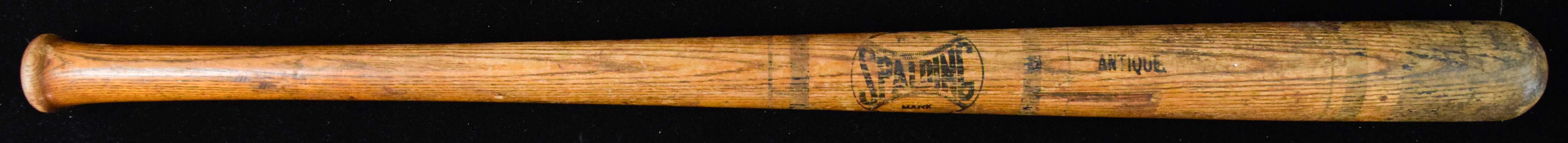Description:Spalding ring decorated "Antique" baseball bat c.1890-1910 (VG) Hand turned 35" long wooden bat has well defined "Spalding" and "No. XX" marking at the center and the word "Antique" stamped to the right. The upper handle and barrell have several painted on ring decorations. General use and some age related wear includes some minor/mild chipping/pitting and some loss to the text/logo/decorations: VG ($400-$600)
