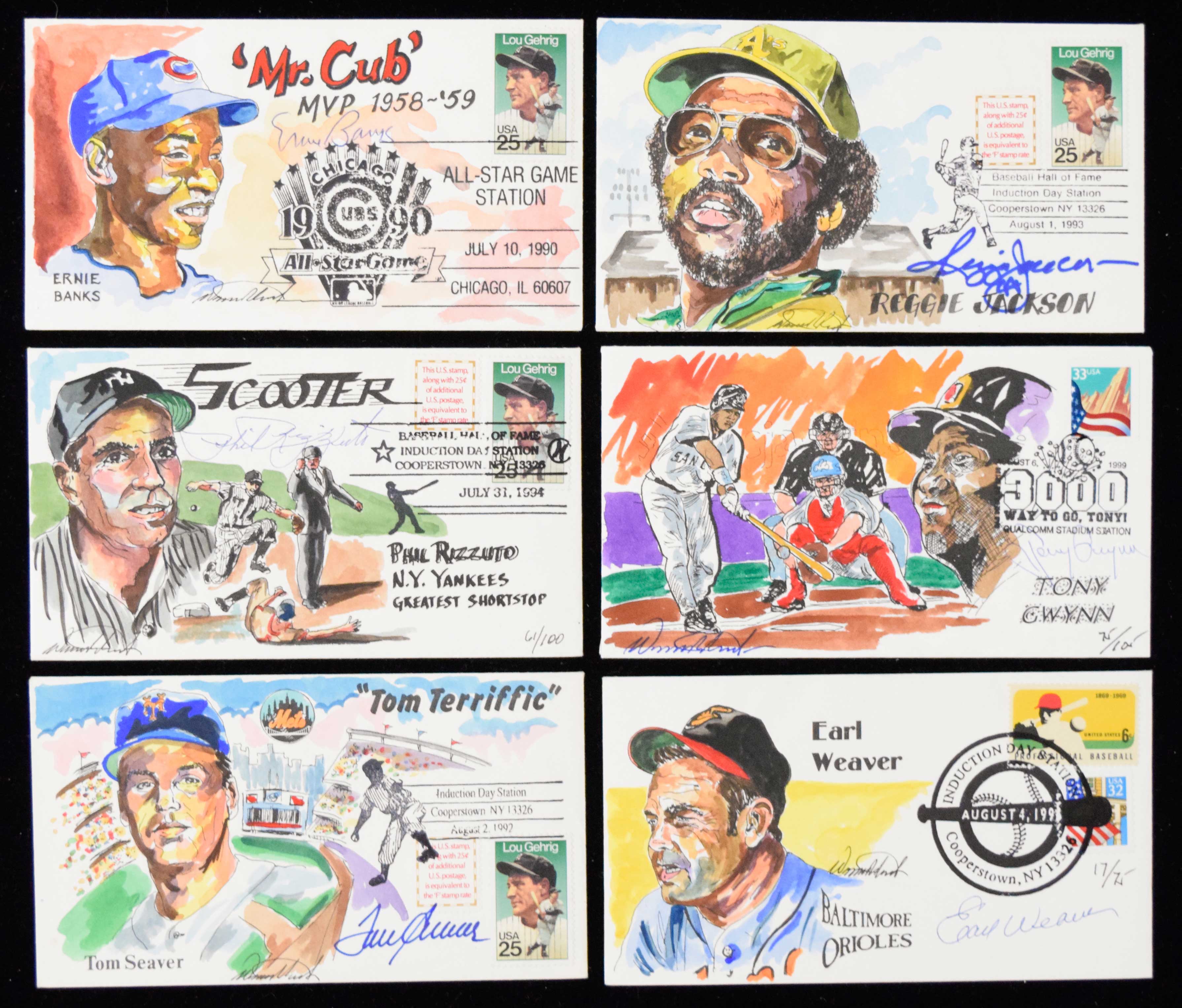 Description:Lot of (7) Baseball HOFers signed Wild Horse Cachets postal covers also signed by artist Warren Reed (NM-NM/MT). Includes (2) different Reggie Jackson, Ernie Banks, Tony Gwynn, Phil Rizzuto, Tom Seaver, and Earl Weaver. Signatures rate 8 to 10 out of 10: NM-NM/MT