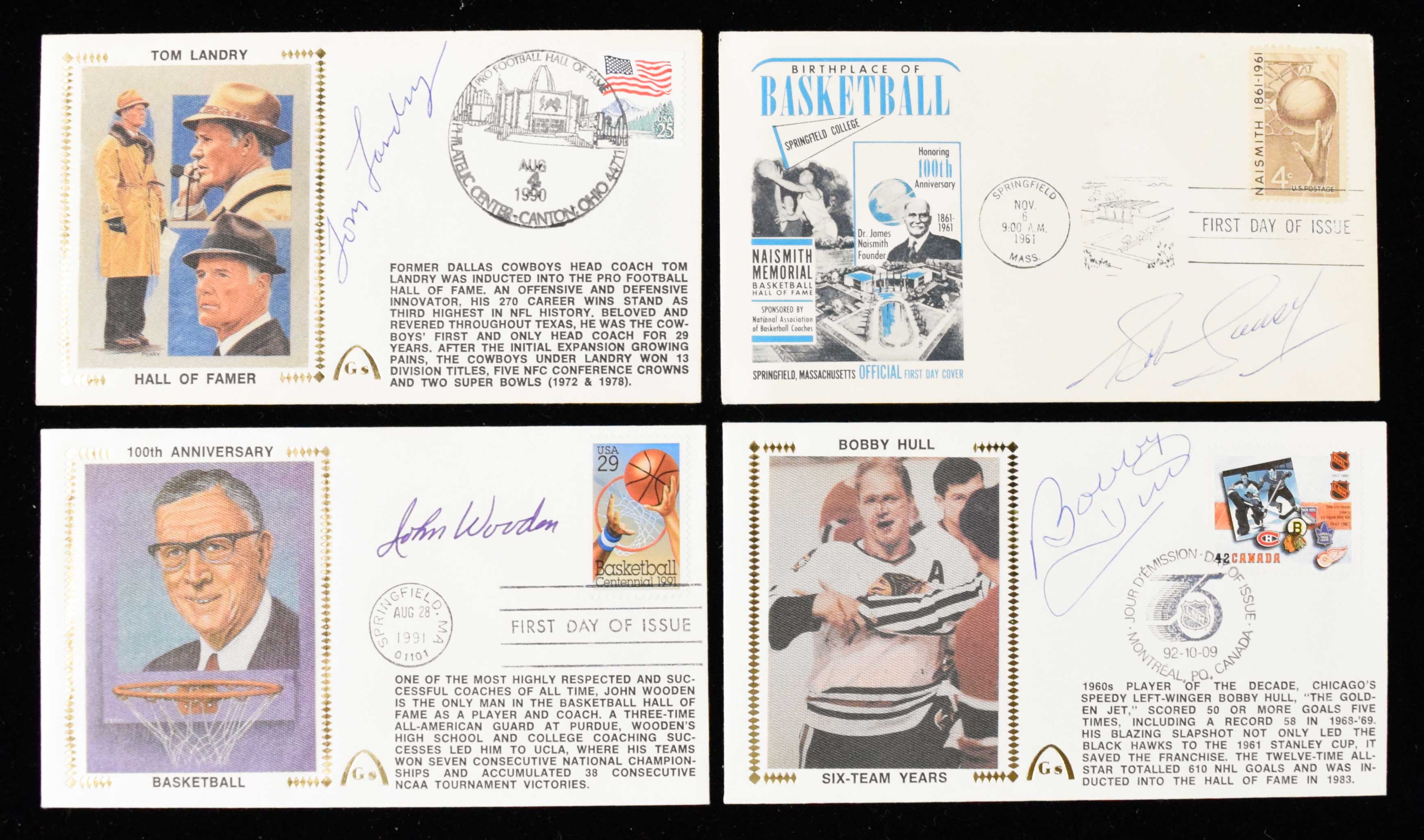 Description:Tom Landry, John Wooden, Bob Cousy, Bobby Hull signed commemorative postal covers (NM-NM/MT). Includes 1961 signed by Bob Cousy, 1990 signed by Tom Landry, 1991 signed by John Wooden, and 1992 signed by Bobby Hull. Signatures rate 8 to 10 out of 10: NM-NM/MT