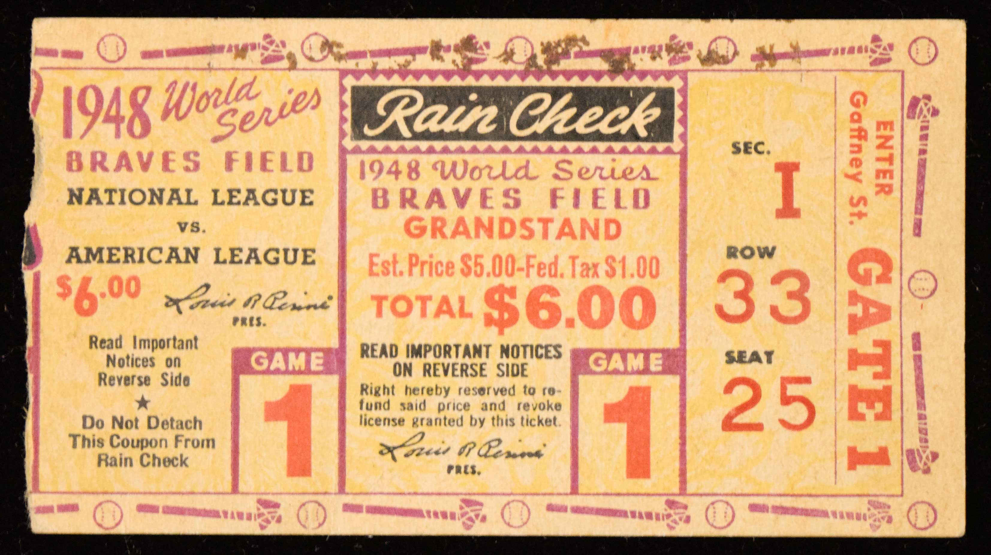 Description:1948 World Series Game 1 ticket stub (VG/EX). Braves Field ticket stub from Game 1 of the 1948 World Series in which the Boston Braves defeated the Cleveland Indians by a score of 1-0. Light creasing (more visible on back), along with some staining along the top edge: VG/EX