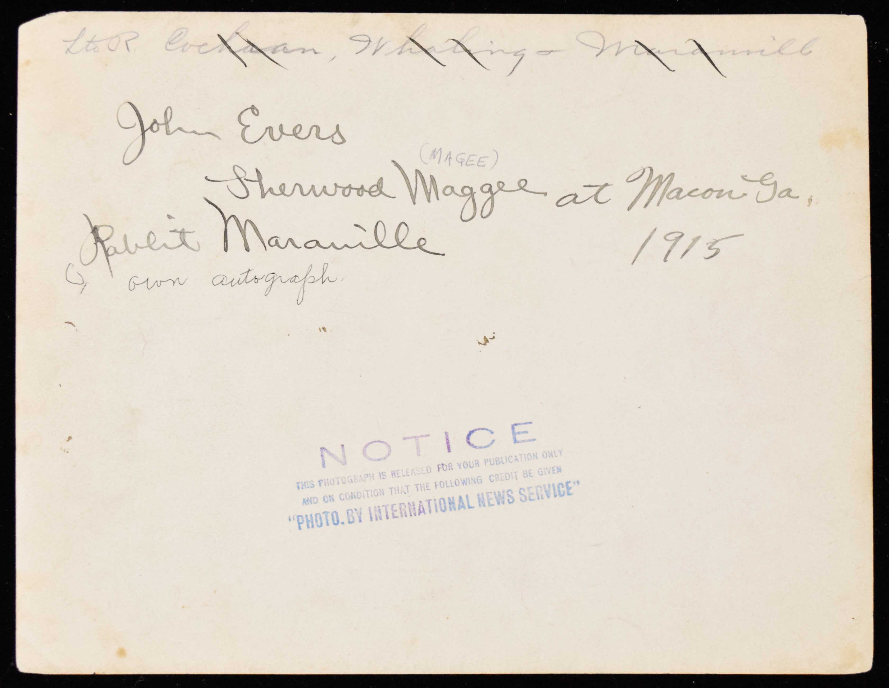 Description:Rabbit Maranville vintage autograph on photo of Evers and others (JSA LOA) (Sig. NM) Bold vintage fountain pen signature appears on the back of a 6.5"x8.5" photograph. Written in his hand is "John Evers, Sherwood Maggee at Macon Ga 1915, Rabbit Maraville" rating 7/8 out of 10. There are some additional notations above and below. The photo shows Evers, Maggee, and another player and is stamped "International News Service" on back. Light general toning/wear. Includes full LOA from JSA: Sig. NM