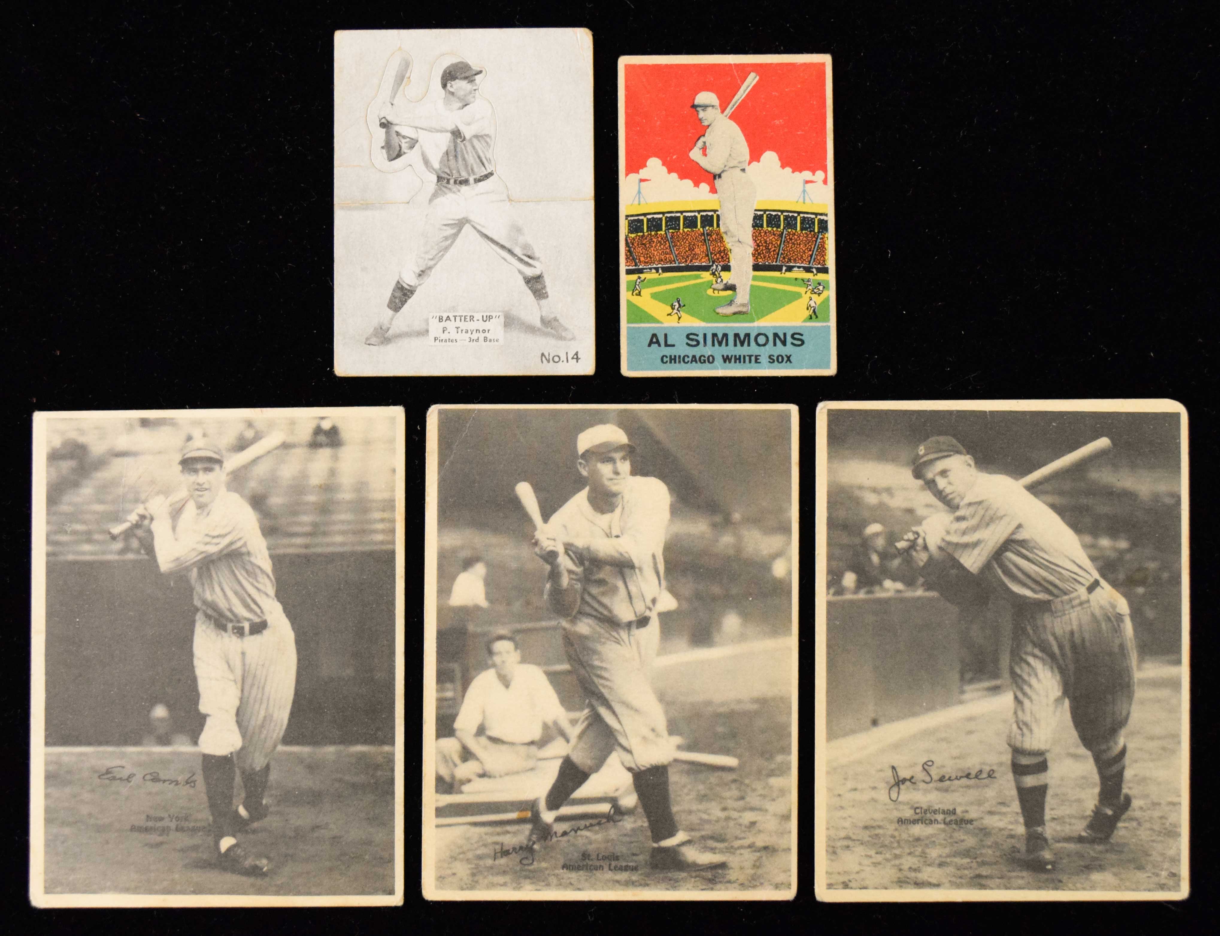 Description:Lot of (5) HOFers baseball cards from 1929-1936 (GD-GD/VG). Includes 1929 Kashin R316 Combs (GD-G/VG), Manush (GD), and Sewell (GD); 1933 DeLong #2 Al Simmons (G/VG); and 1934-36 Batter-Up #14 Pie Traynor (GD-G/VG).