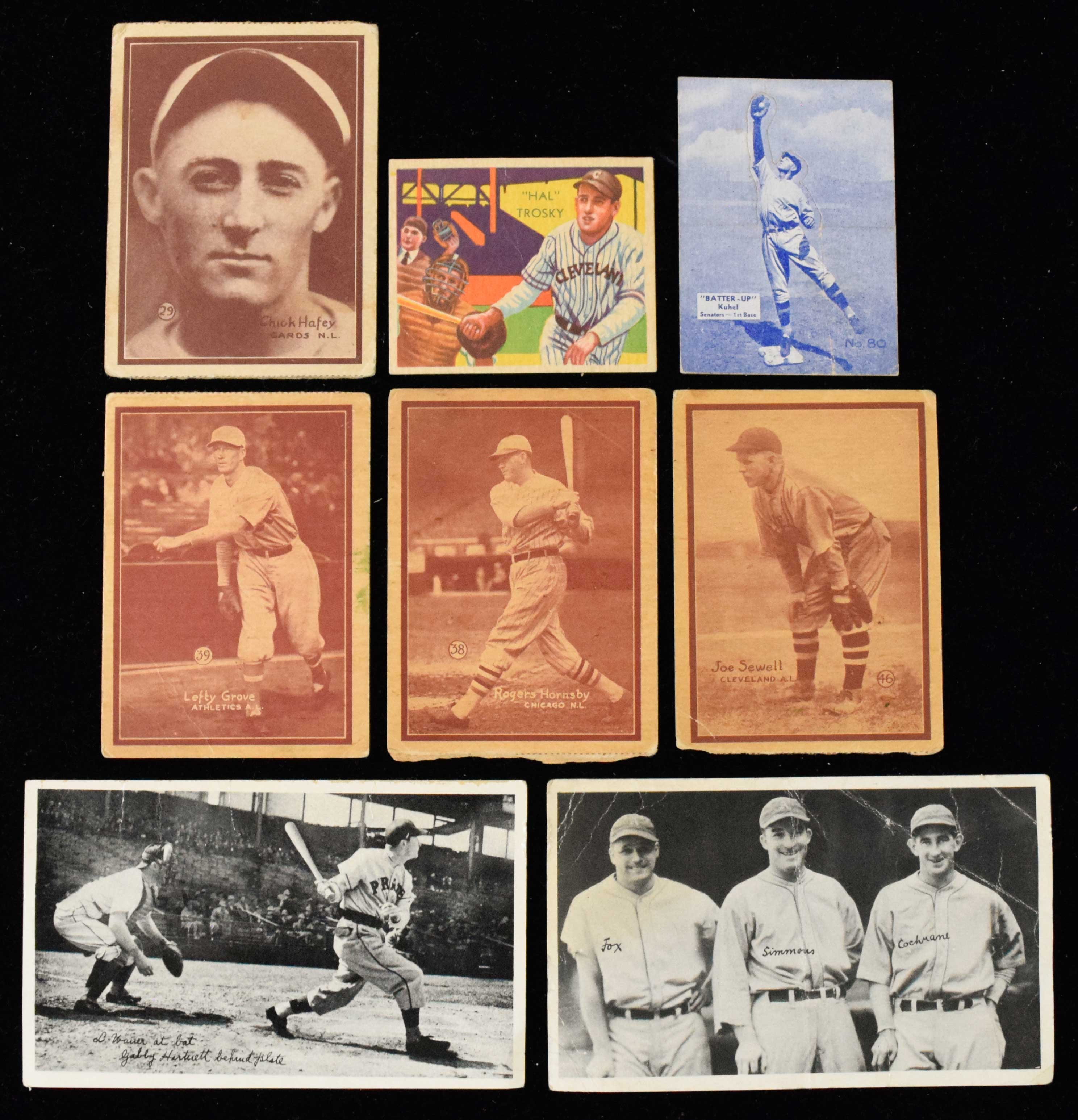 Description:Lot of (21) baseball cards from 1929-1936 including HOFers (PR-VG). Includes 1929 Kashin R316 Elwood English, Willie Kamm, Fred Leach, Ad Liska, Oscar Mellilo, and Fred Schulte (PR-VG, avg GD); 1931 W517 #s 7 Shore, 29 Chick Hafey (GD), 38 Rogers Hornsby (GD), 39 Lefty Grove (GD), 46 Joe Sewell (GD), and 50 Blue (note written from mother to son on the back); 1934-36 Batter-Up #s 9 Bridges, 52 Schumacher, 65 Bonura, 75 Frankhouse, and 80 Kuhel (very PR - VG, avg FR/GD); 1935 Diamond Stars #s 70 Trosky (VG), and 79 Hudlin (VG); 1936 National Chicle "Fine Pens" R313 Gabby Hartnett / Lloyd Waner (GD), and Mickey Cochrae / Jimmie Foxx / Al Simmons (FR-FR/GD).