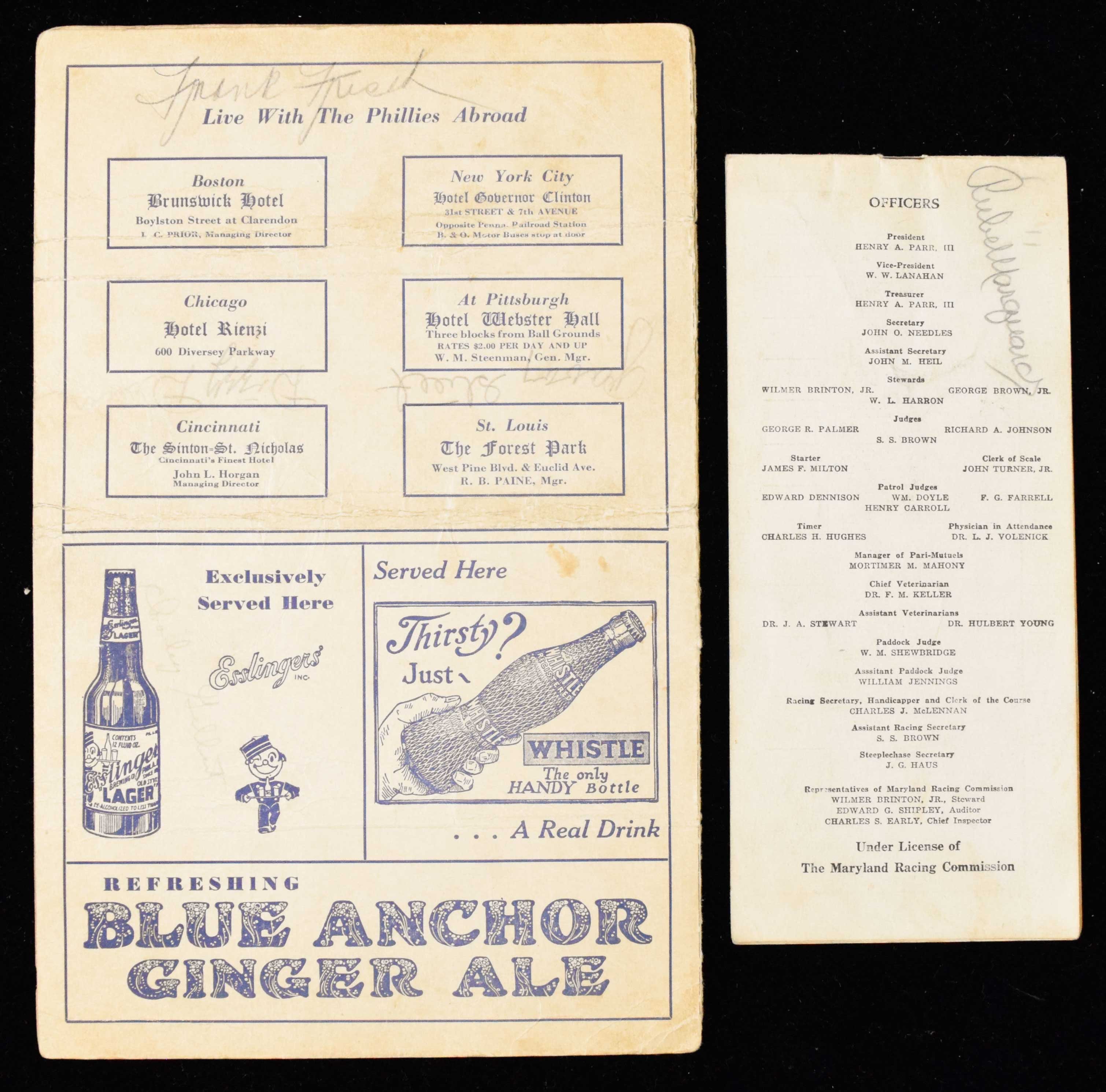 Description:Rube Marquard autograph plus multi-signed scorecard with Dizzy Dean & Frankie Frisch (GD-EX). Includes 1932 St. Louis Cardinals at Philadelphia Phillies scorecard multi-signed by Dizzy Dean, Frank Frisch, Gabby Street, and Charley Gelbert (GD, scored, heavy handling wear); 11/1/1946 Pimlico horse racing program signed by Rube Marquard (EX). Signatures rate 7 to 8/9 out of 10: GD-EX