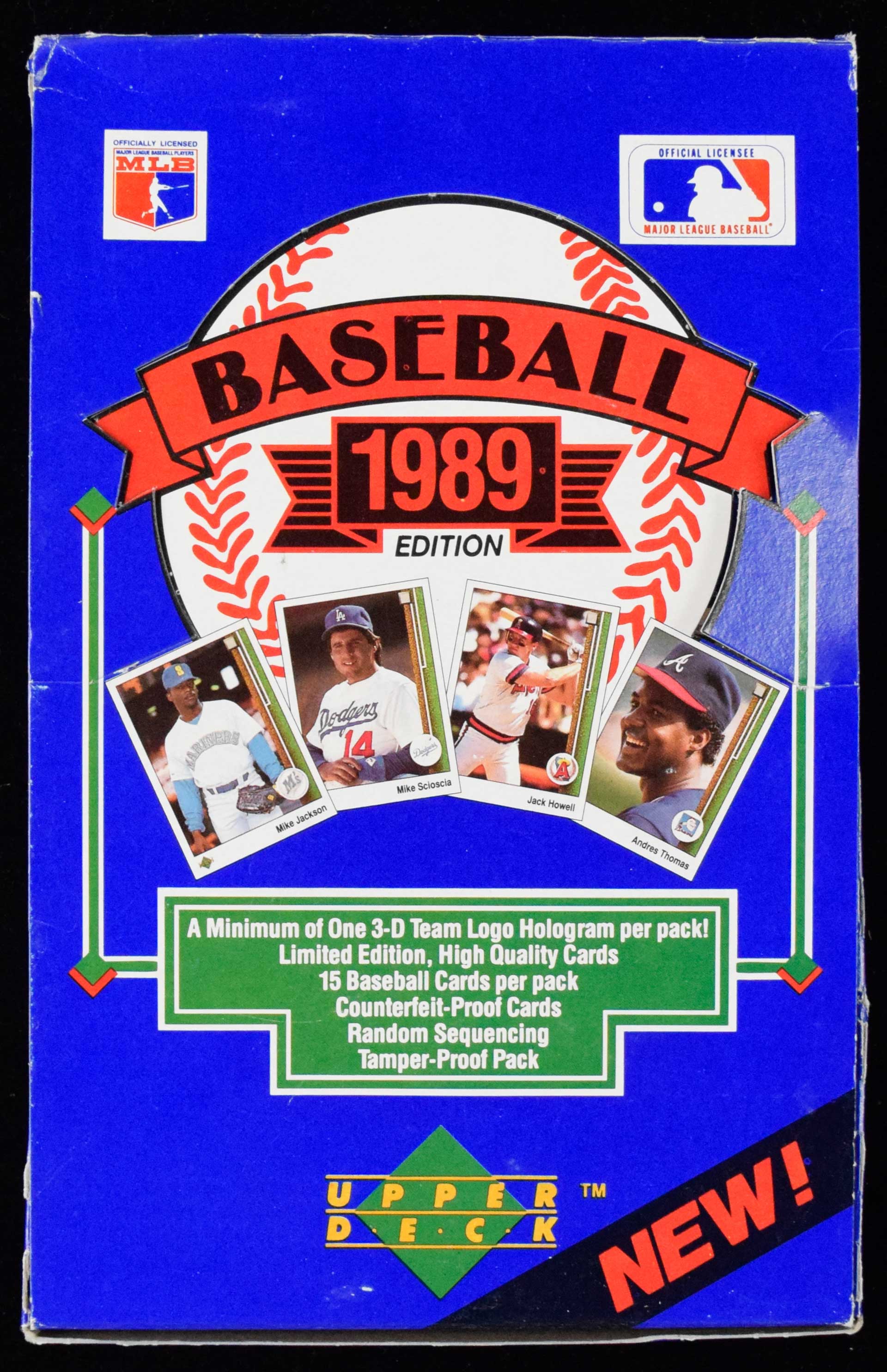 Description: 1989 Upper Deck low number unopened wax box (EX-NM) Complete box of unopened packs with some shelf/storage wear outer box. Packs average EX/MT-NM or better: EX-NM