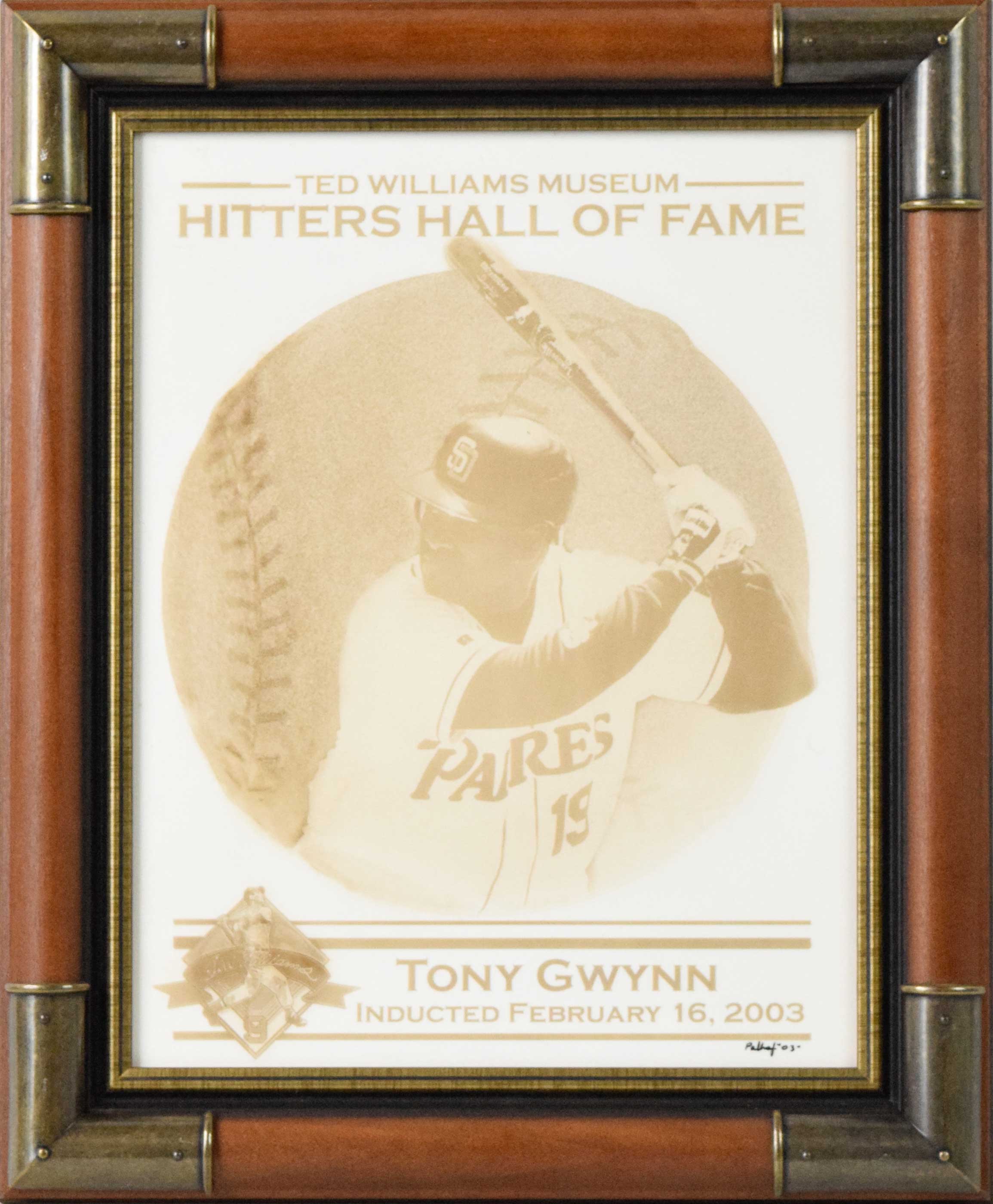 Description:Tony Gwynn plaque from the Ted Williams Hitters Hall Of Fame (NM). Approx. 15"x17.5" plaque with COA from the Ted Williams Museum stating that the plaque was presented at the original Ted Williams Museum and then transferred to the new Ted Williams Hitters Hall Of Fame at Tropicana Field where it was displayed until 2019: NM