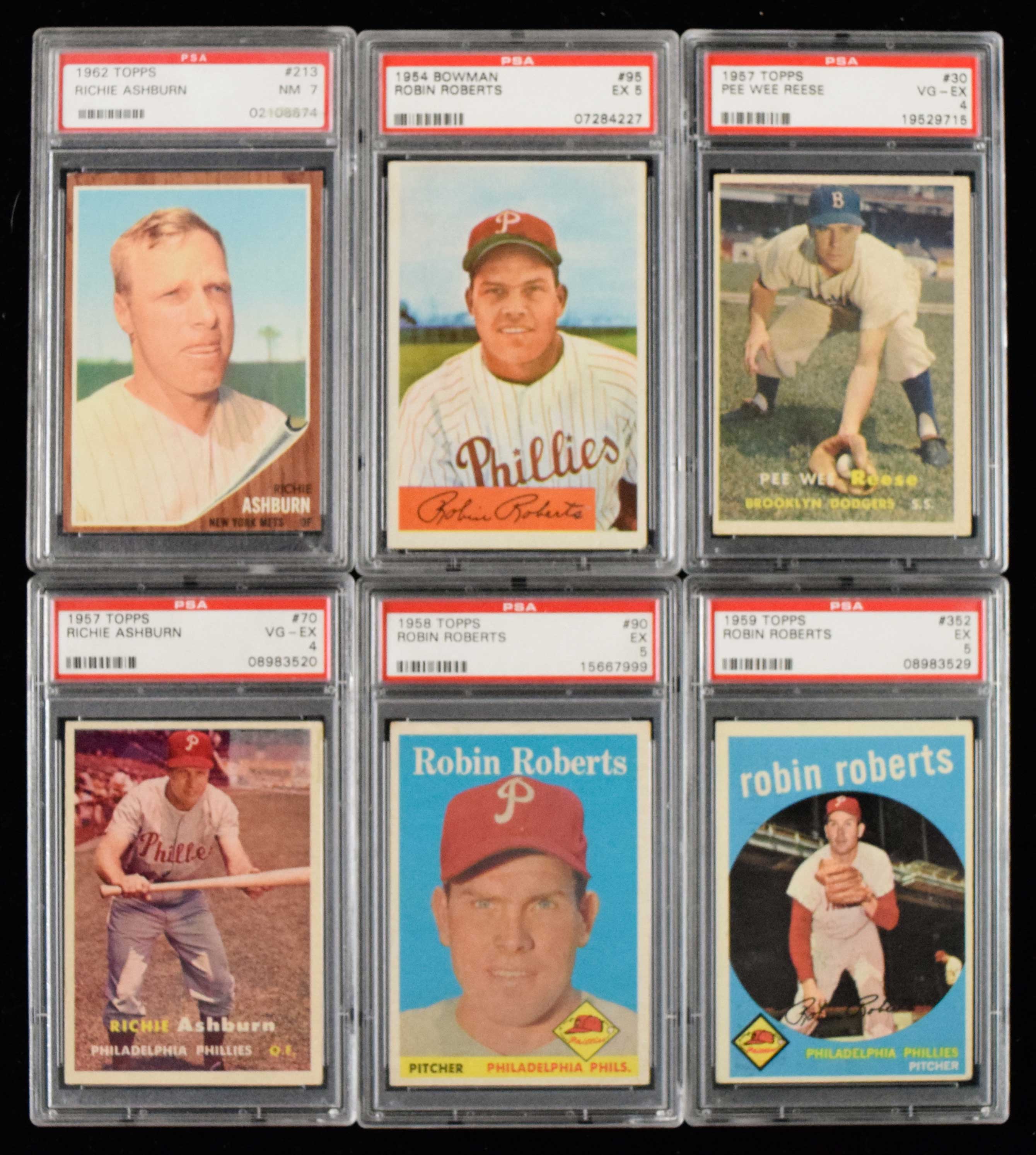 Lot of (6) Richie Ashburn, Pee Wee Reese, and Robin Roberts graded baseball cards from 1954-1959 (VG/EX-NM). Includes 1954 Bowman #95 Roberts (PSA 5 EX); 1957 Topps #s 30 Reese (PSA 4 VG/EX), and 70 Ashburn (PSA 4 VG/EX); 1958 Topps #90 Roberts (PSA 5 EX); 1959 Topps #352 Roberts (PSA 5 EX); and 1962 Topps #213 Ashburn (PSA 7 NM).
