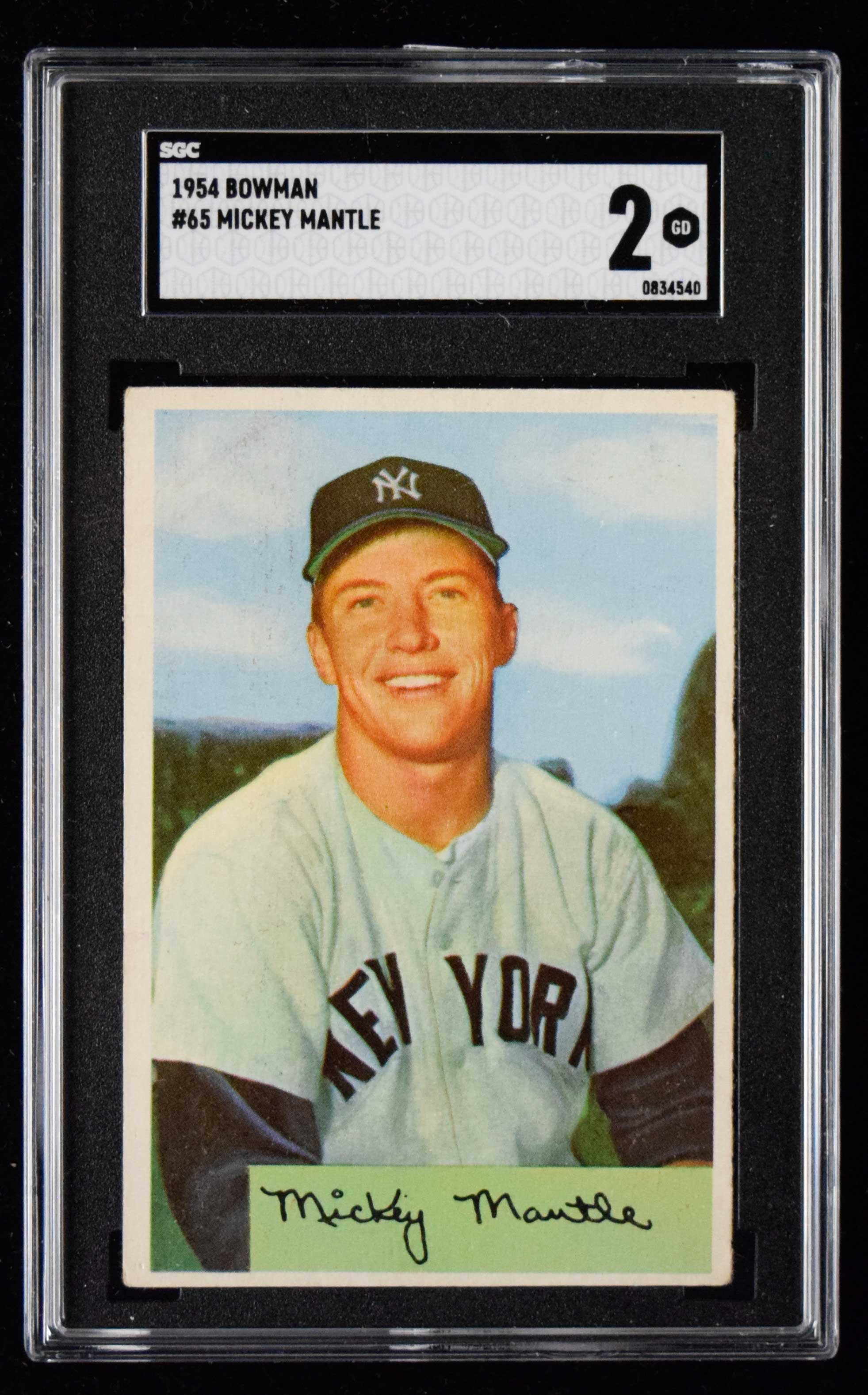 Description:1954 Bowman #65 Mickey Mantle (SGC 2 GD) Relatively well centered with strong eye appeal for the grade that is due to some creases at upper left (these do not break the surface of the card): SGC 2 GD