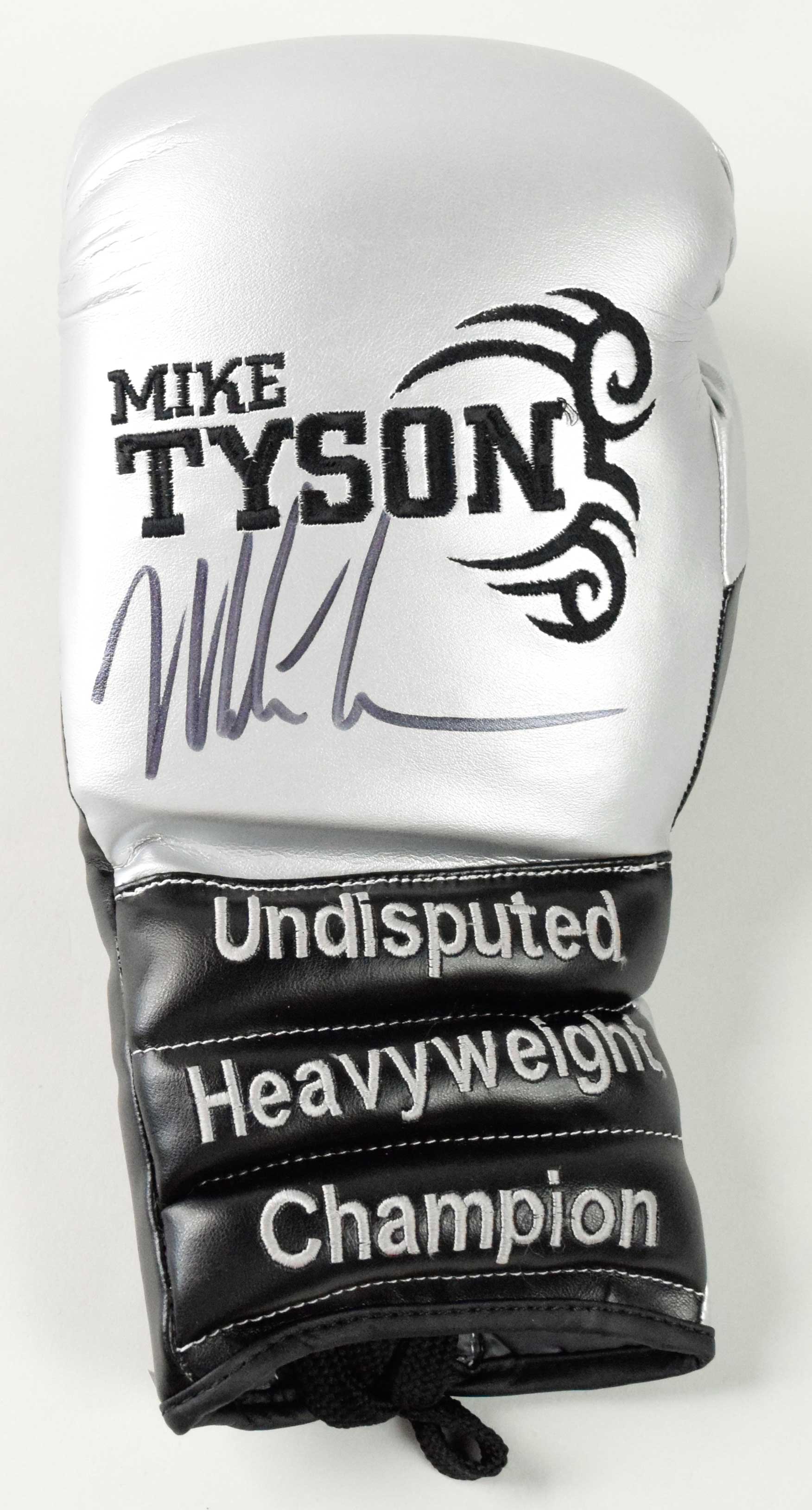 Description:Mike Tyson signed embroidered boxing glove - JSA (NM). Mike Tyson "Undisputed Heavyweight Champion" embroidered glove signed by Tyson in black marker. Signature rates 8/9 out of 10. JSA serial #ed sticker is on the glove: NM