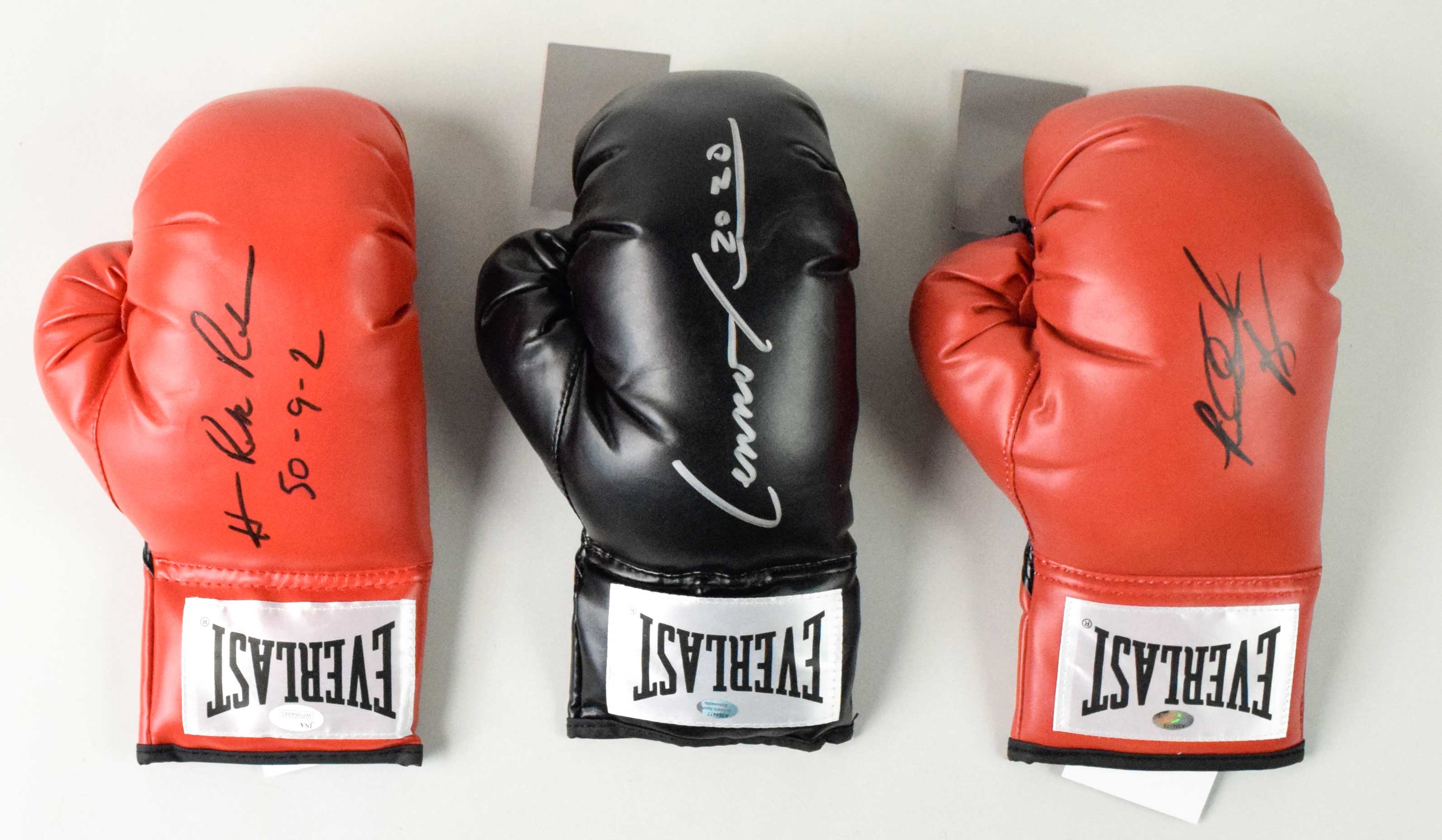 Description:Riddick Bowe, Lennox Lewis, and Hasim Rahman signed boxing gloves (NM-NM/MT). Includes a red Everlast glove signed by Riddick Bowe (Schwartz Sports), black Everlast glove signed by Lennox Lewis (Schwartz Sports), and red Everlast glove signed by Hasim "Rock" Rahman with "50-9-2" inscription (JSA). Signatures rate 8/9 to 9/10 out of 10: NM-NM/MT